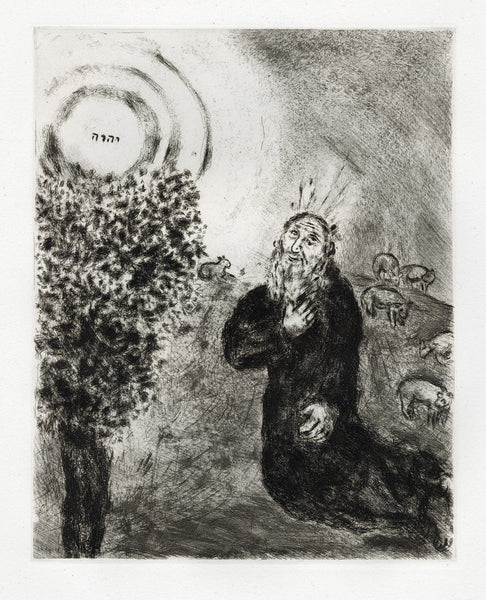 This etching is from Chagall’s sublime Bible series. Almost 10 years in the making, and comprising over 100 etchings, it was the third of Chagall’s etching suites to be commissioned by the publisher Ambroise Vollard. Chagall’s Jewish identity had always informed his work; in this major suite, begun in 1930, it was to take centre stage.