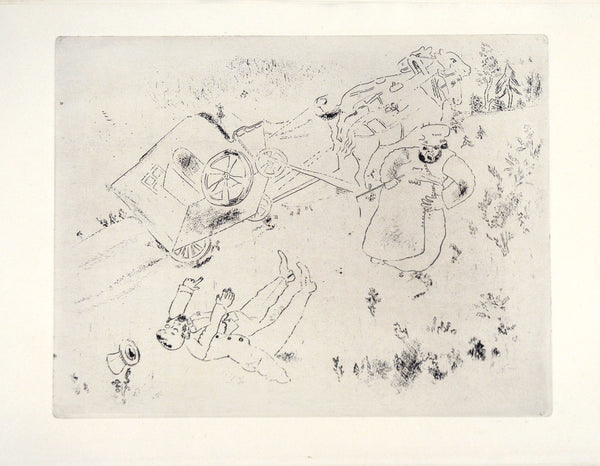 The etchings for the Dead Souls were executed between 1923 and 1927 and printed in 1927 where they then lay in Vollard’s warehouse ‘sleeping their sweet sleep’ as Chagall put it. They were finally united with the text and published by Tériade in 1948 after Vollard’s untimely death.