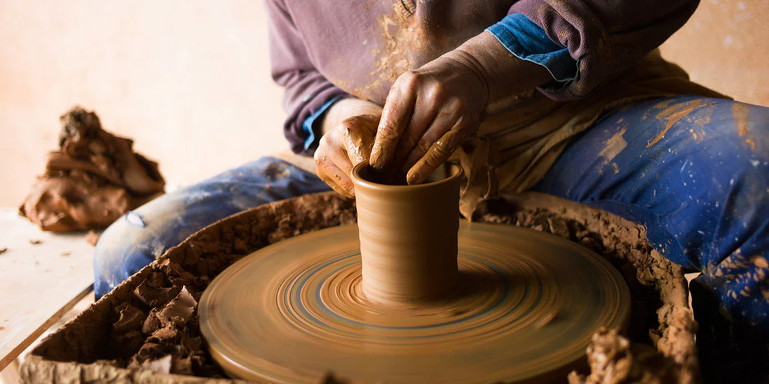 Gérard shapes the side of a beaker with a metal sheet (above) before smoothing the rim (below left) and removing it from the wheel to dry (right)