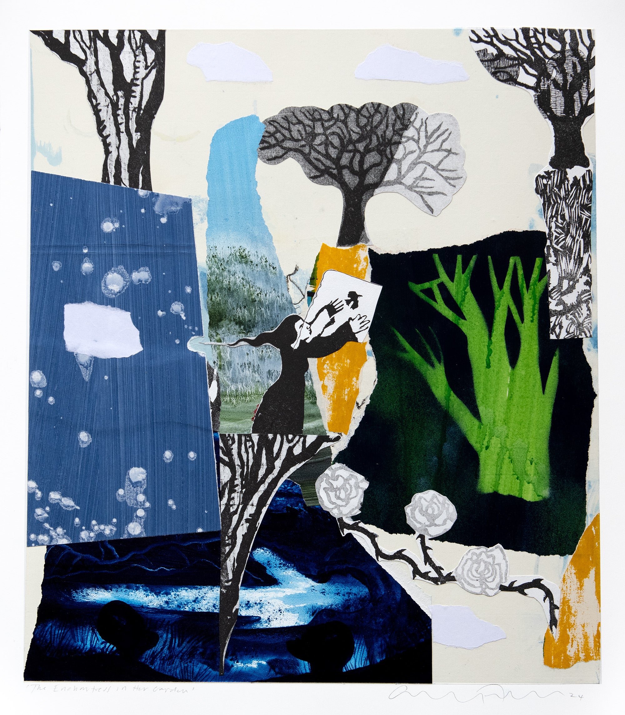 Collage includes found papers, painted and printed material by Wood and characters from cut down etchings that the artist has made for the series.