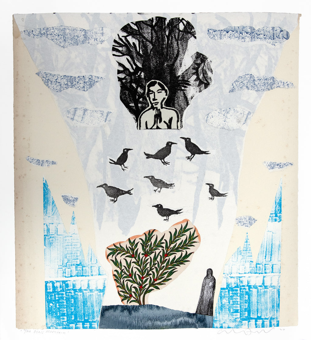 Collage includes found papers, painted and printed material by Wood and characters from cut down etchings that the artist has made for the series.