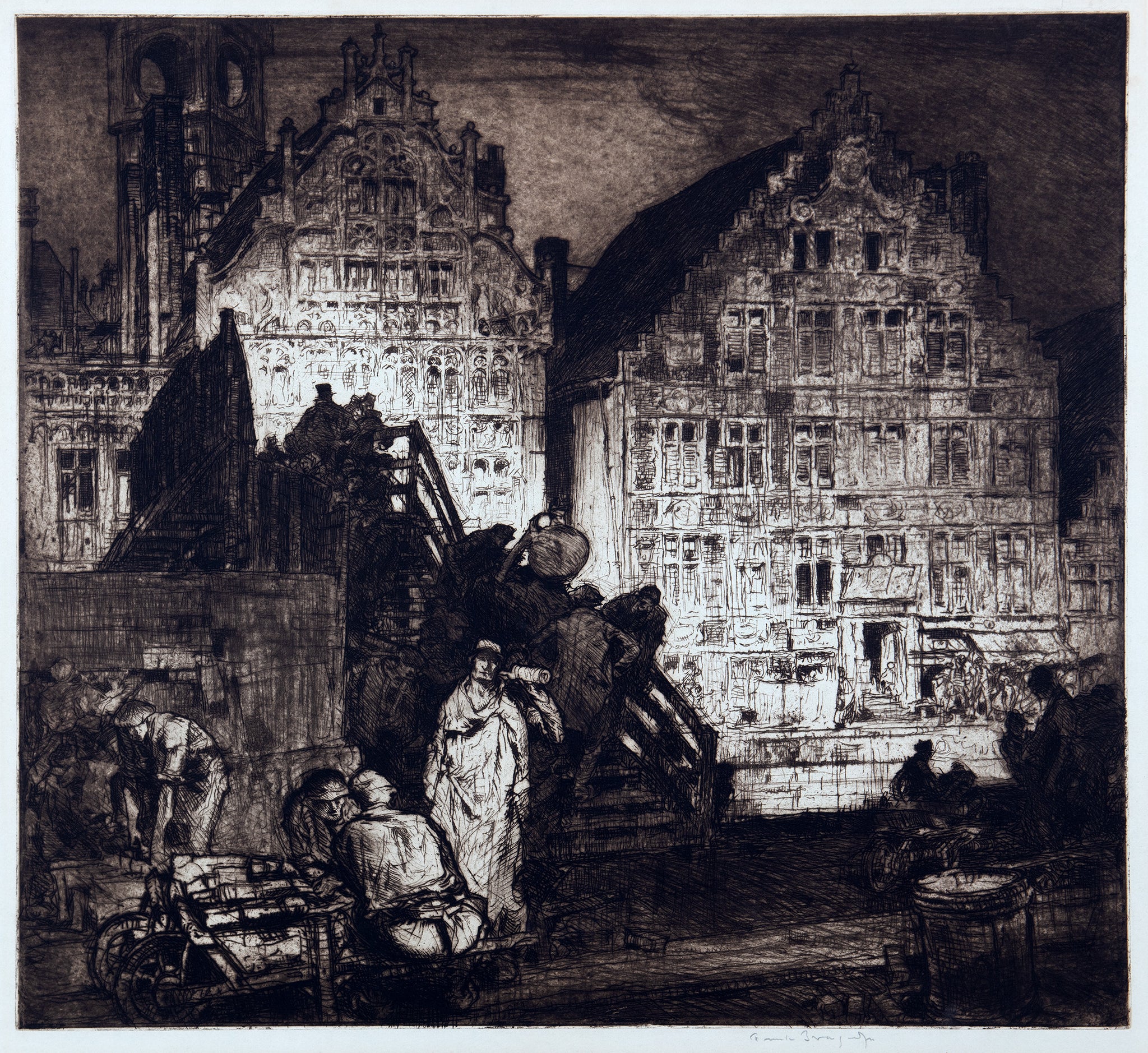 In the 1900s Brangwyn began designing furniture, textiles, ceramics and other media. He was made an Official War artist in World War I, gaining repute through his posters, and was further recognised with an RA appointment (1919) and a knighthood (1941). Brangwyn was given a major retrospective exhibition at the Royal Academy, the first time this honour had been accorded to a living artist.