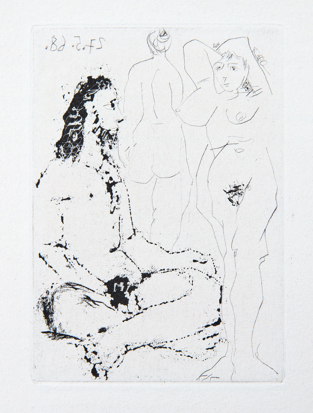 Between March 16 and October 5, 1968, Picasso worked on the plates almost daily, using various techniques (sometimes on the same plate); he was impatient to see the impression as soon as it was pulled by Aldo and Piero Crommelynck, who had installed their atelier at Mougins.