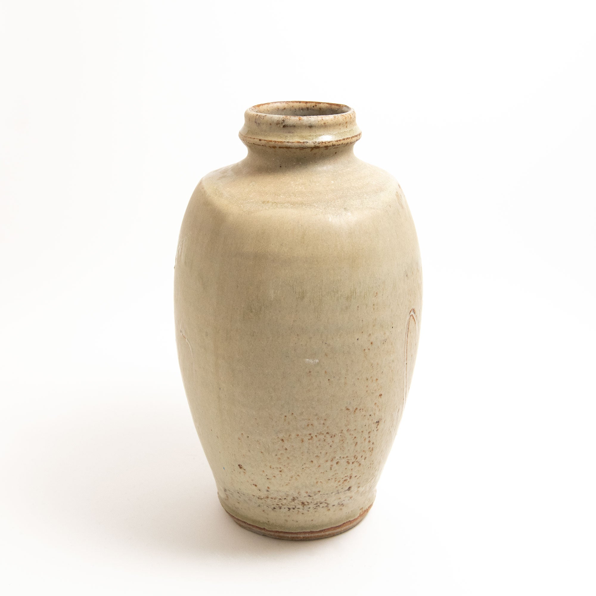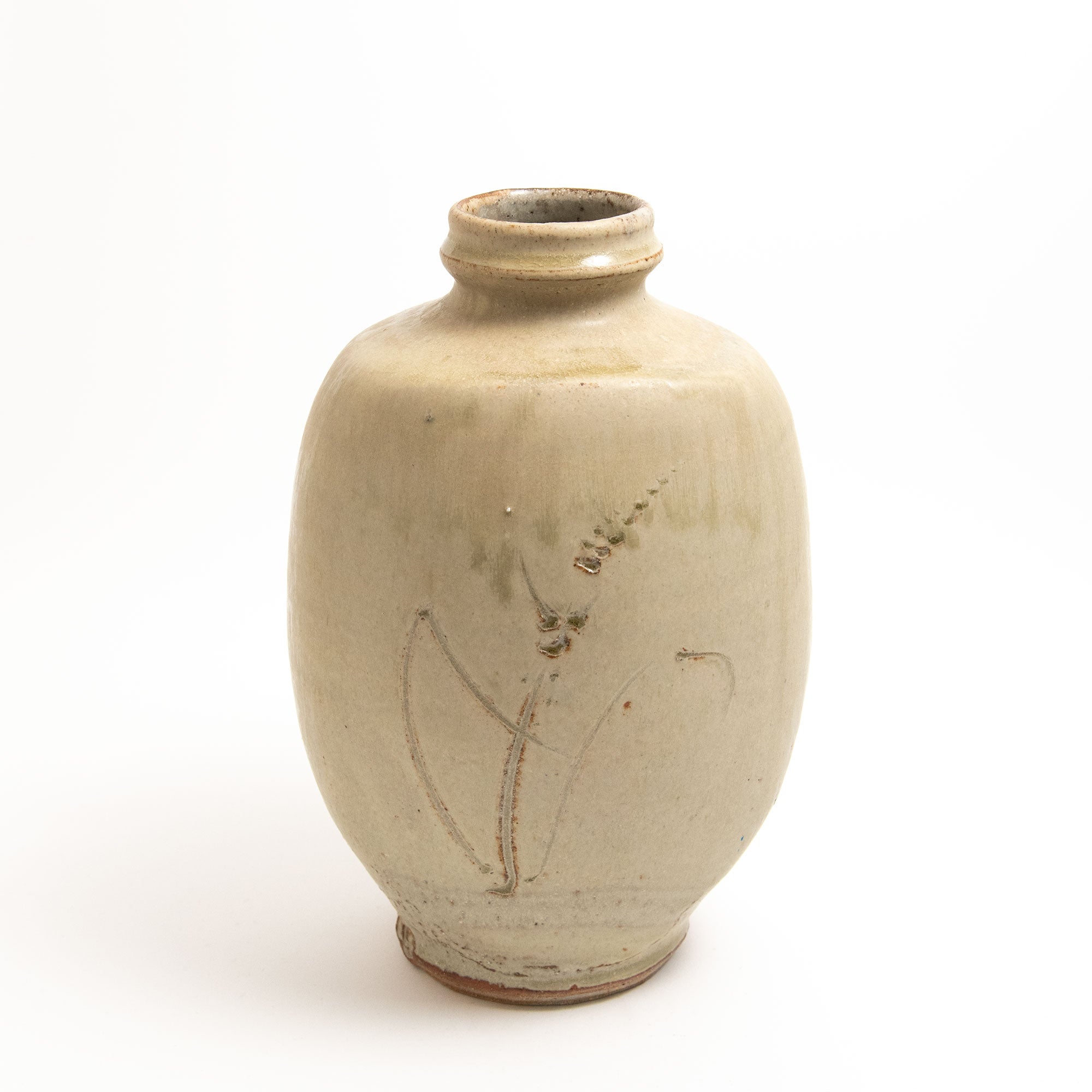 Bashed flat. Engraved grasses design. Hawthorn ash glaze