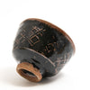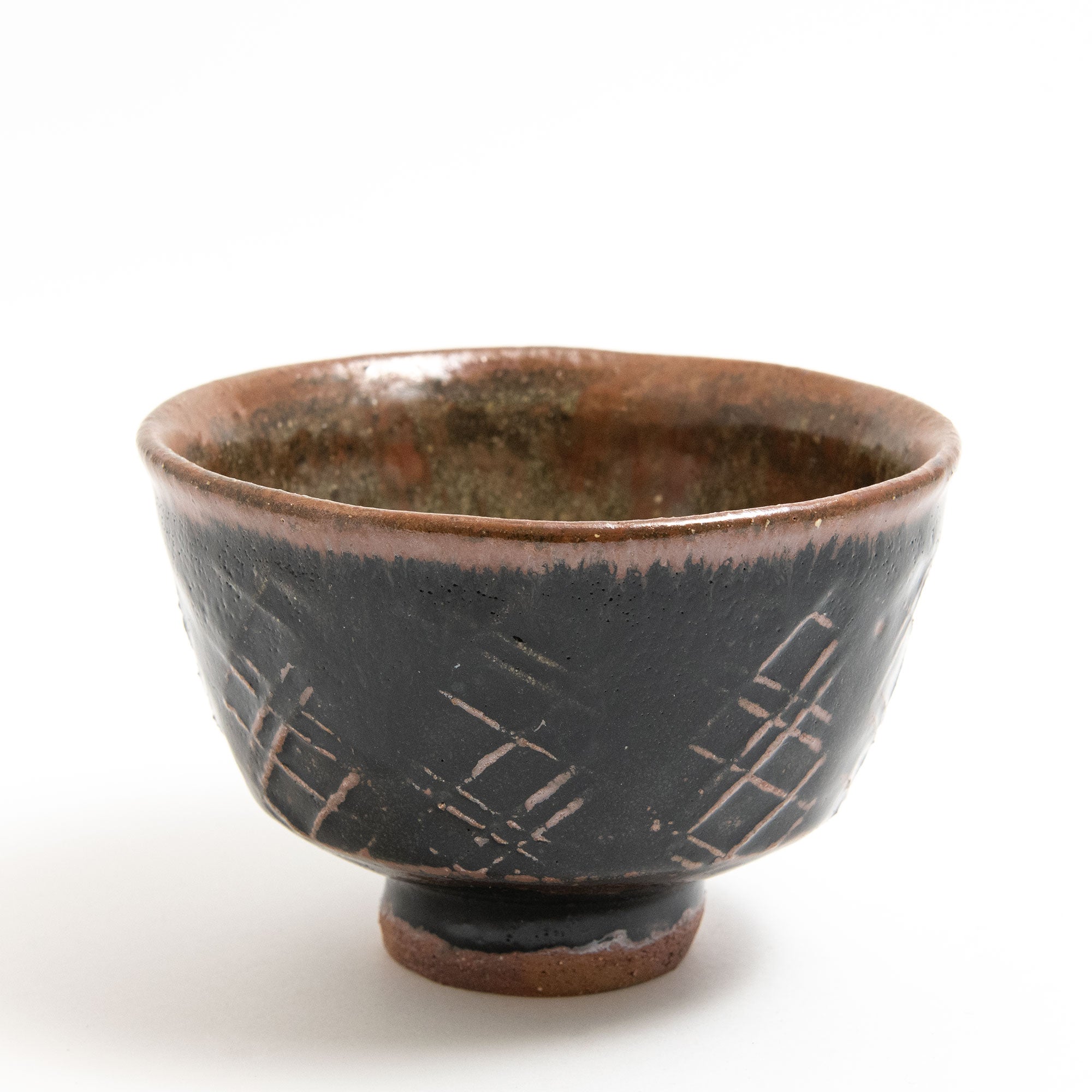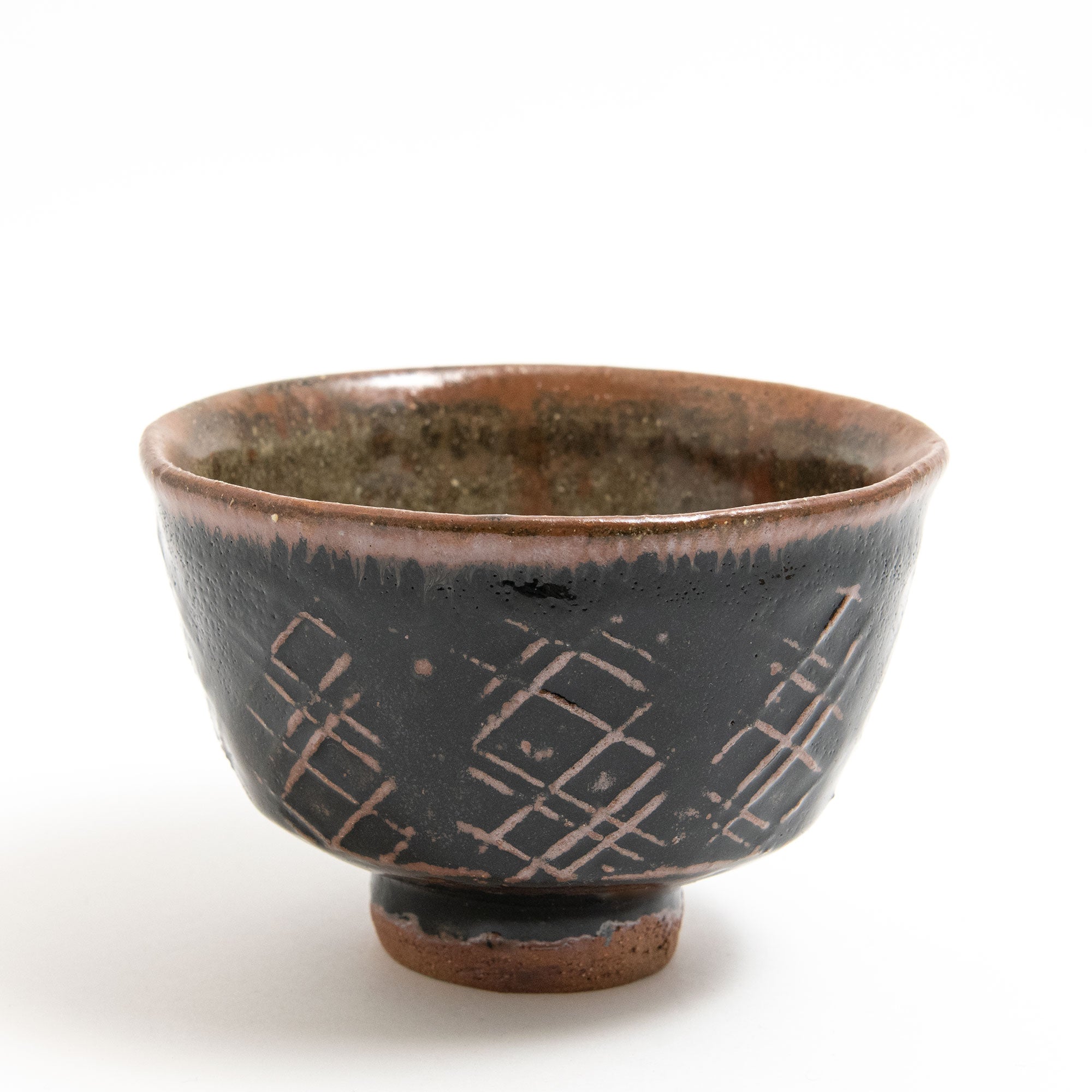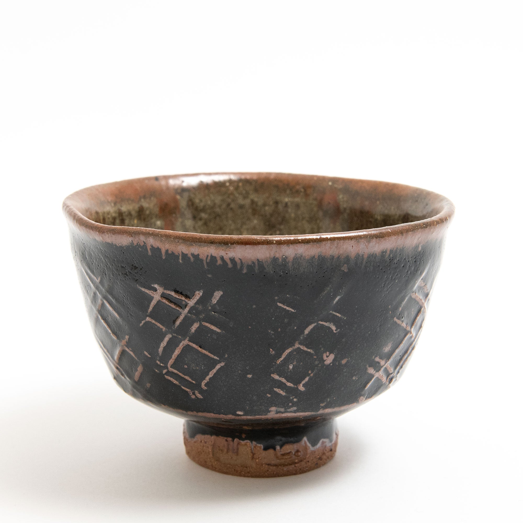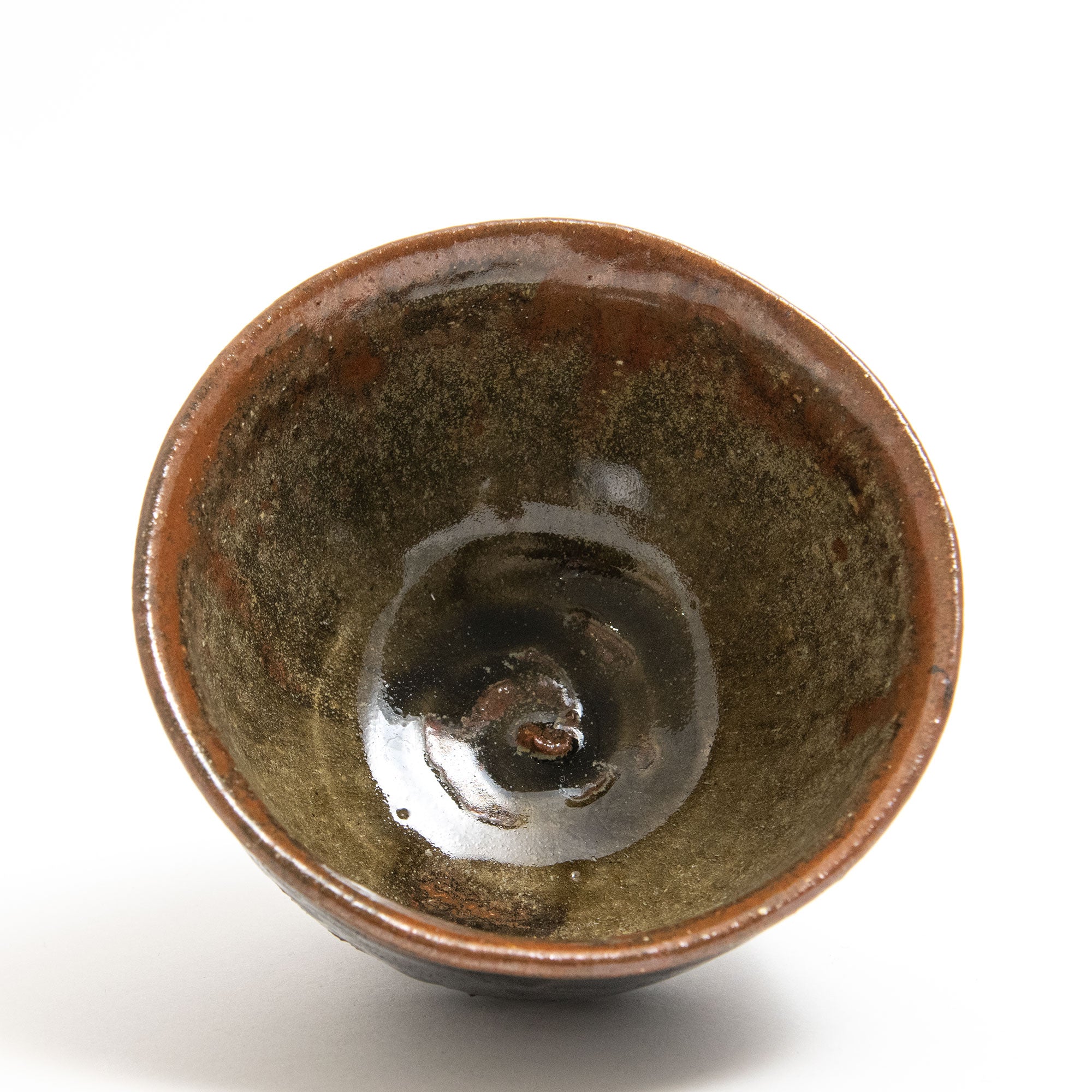 • Paddled. Tenmoku glaze with ash inside • Signed • 9cm x 13cm