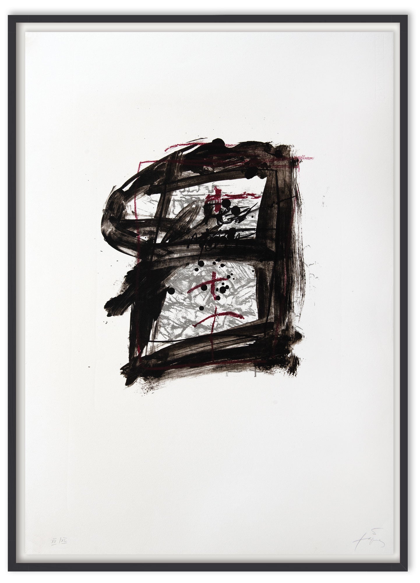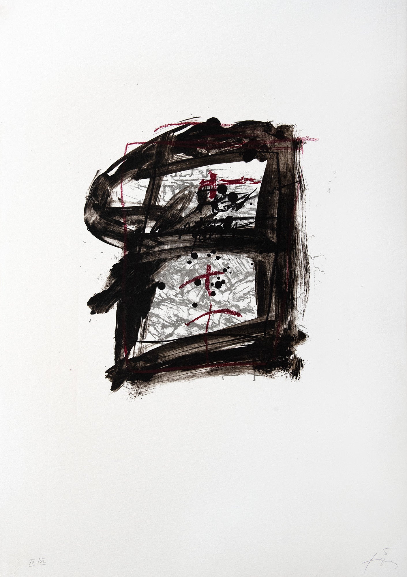A Spanish painter, lithographer and etcher, Tàpies was born in Barcelona. He studied law at Barcelona University 1943-6, then gave this up to devote himself to painting. He studied for two months in 1944 at a drawing school in Barcelona, the Valls Academy; otherwise self-taught. In 1945-7 he made many works with thick impasto, collages, found objects and graffiti.