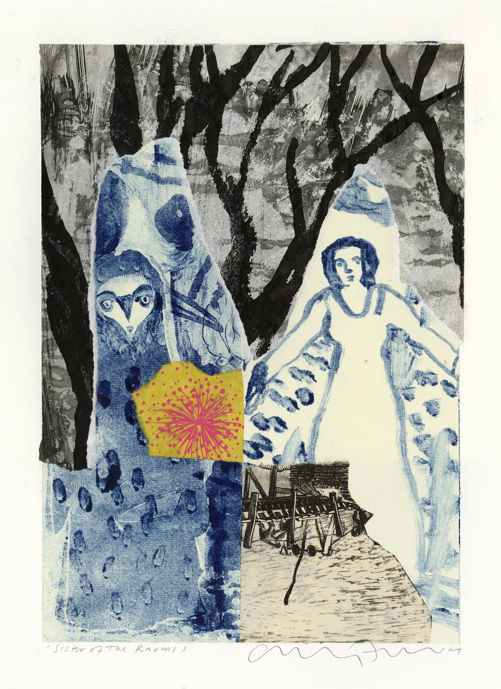 Collage includes found papers, painted and printed material by Wood and characters from cut down etchings that the artist has made for the series.