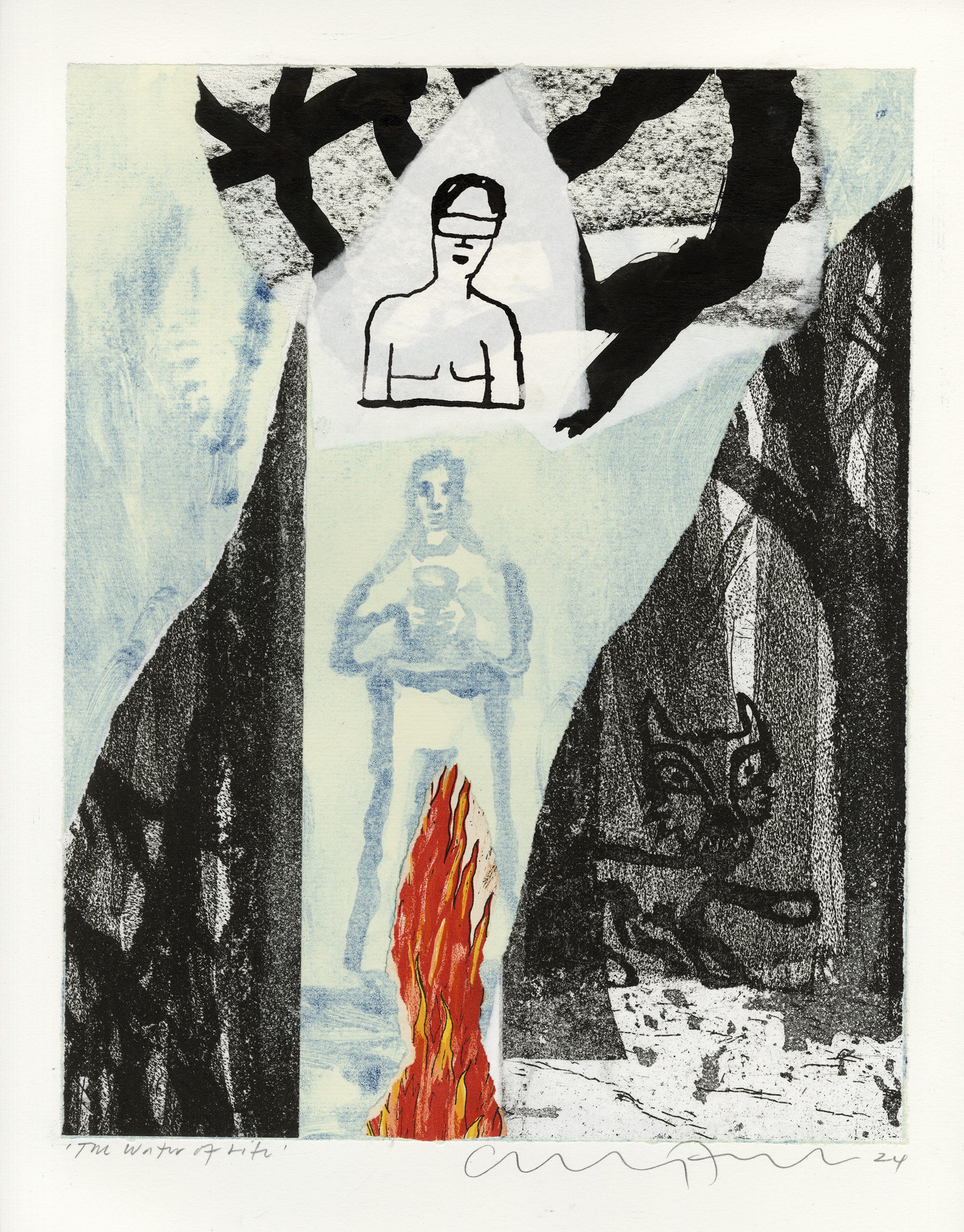 Collage includes found papers, painted and printed material by Wood and characters from cut down etchings that the artist has made for the series.