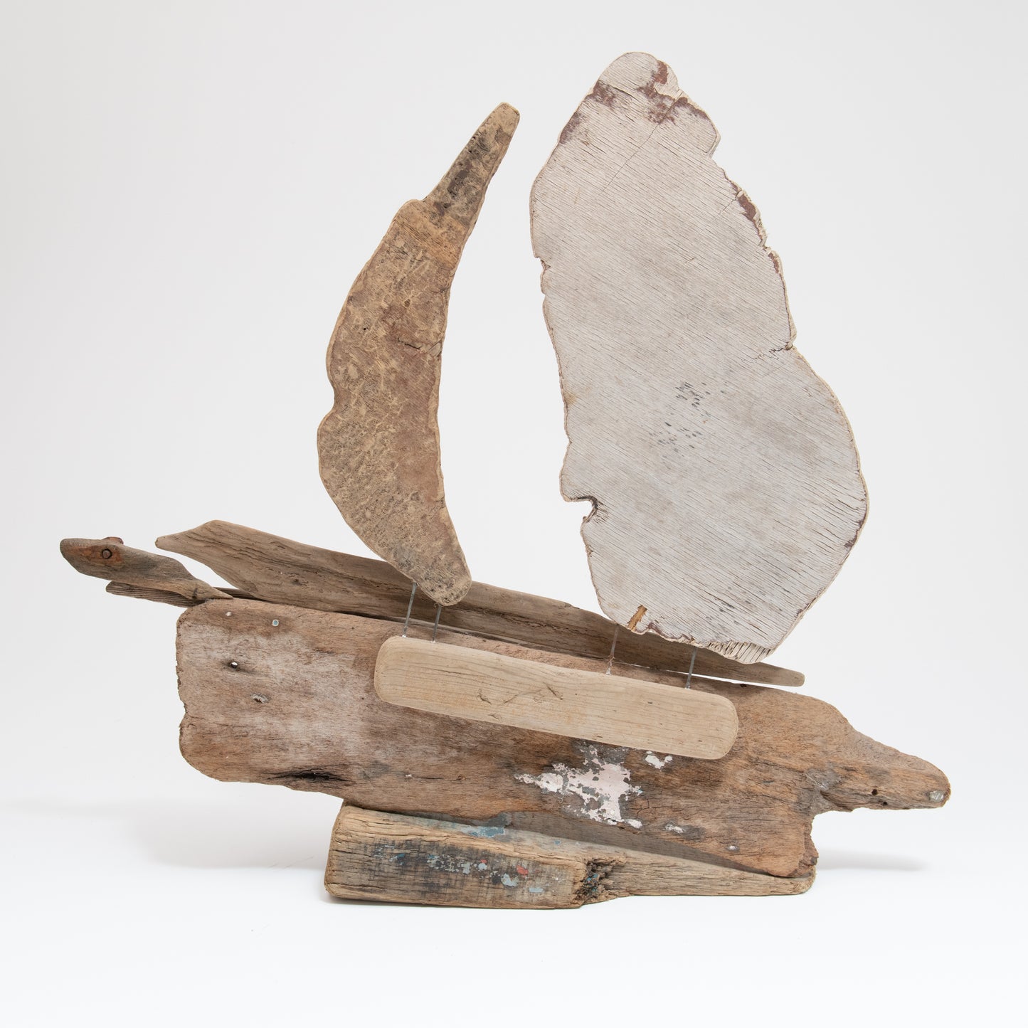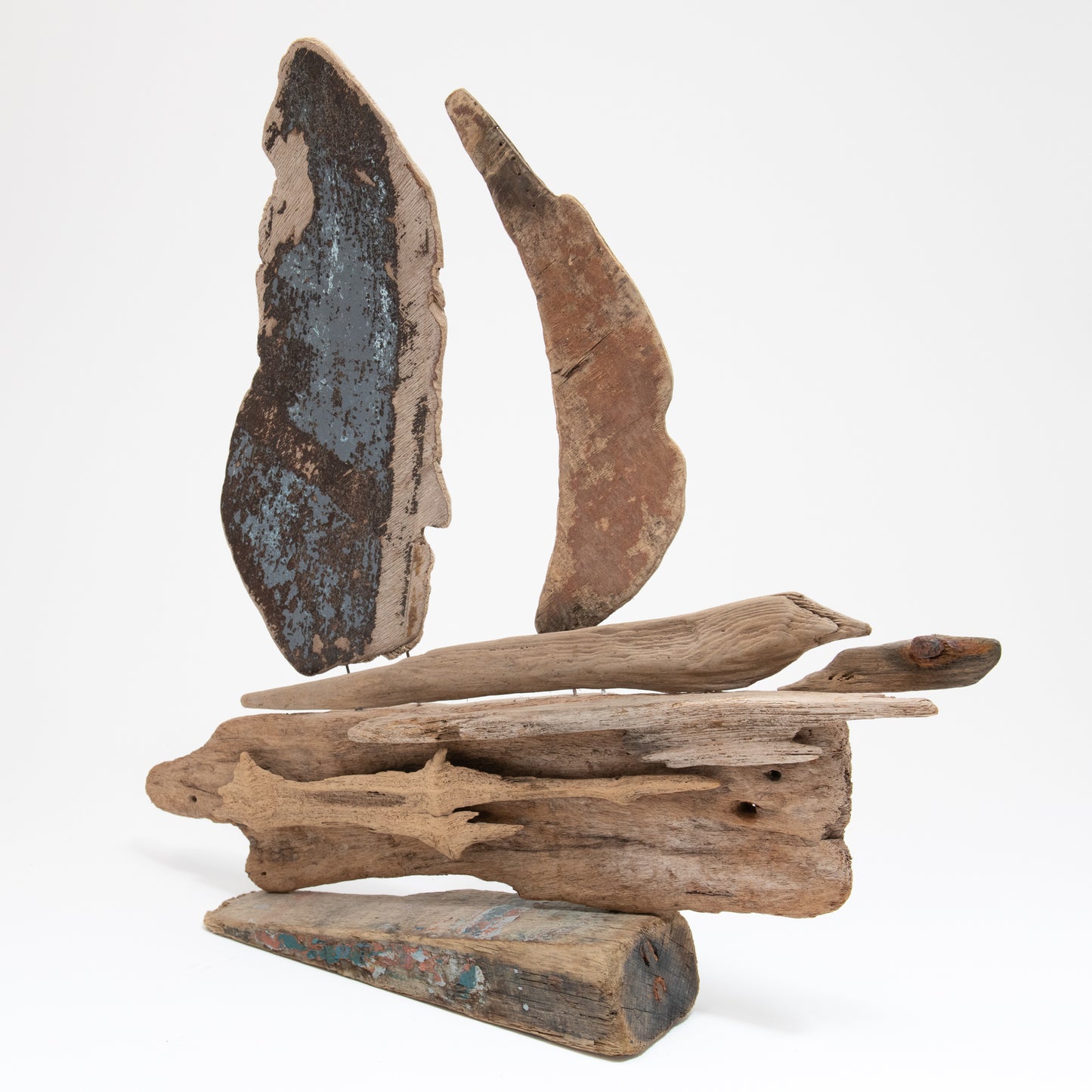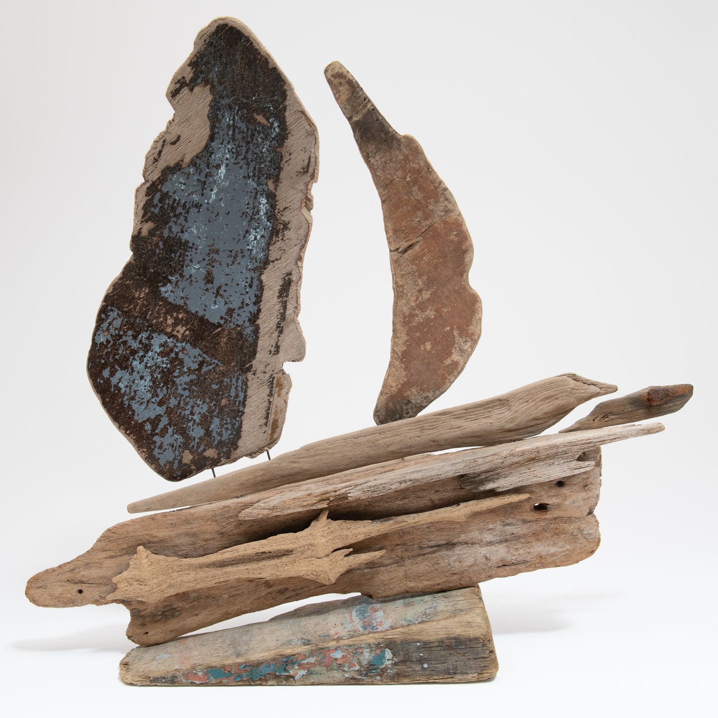 He is now based in Borth near Aberystwyth in Wales, where the flotsam and jetsam from the nearby sea is his only source of materials. Working with found objects, nothing is changed - simply introduced to one another. His driftwood pieces, usually birds, boats or mythical beasts, are full of his passion, integrity and wonderful humour.