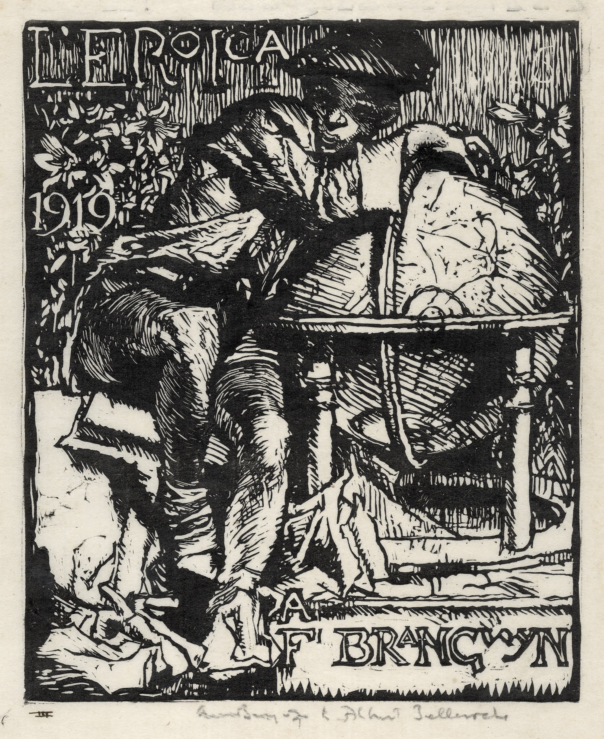 Illustration for the Italian magazine L'Eroica, cut by H.G Webb after Brangwyns design for a similar bookplate orignally made in 1914.