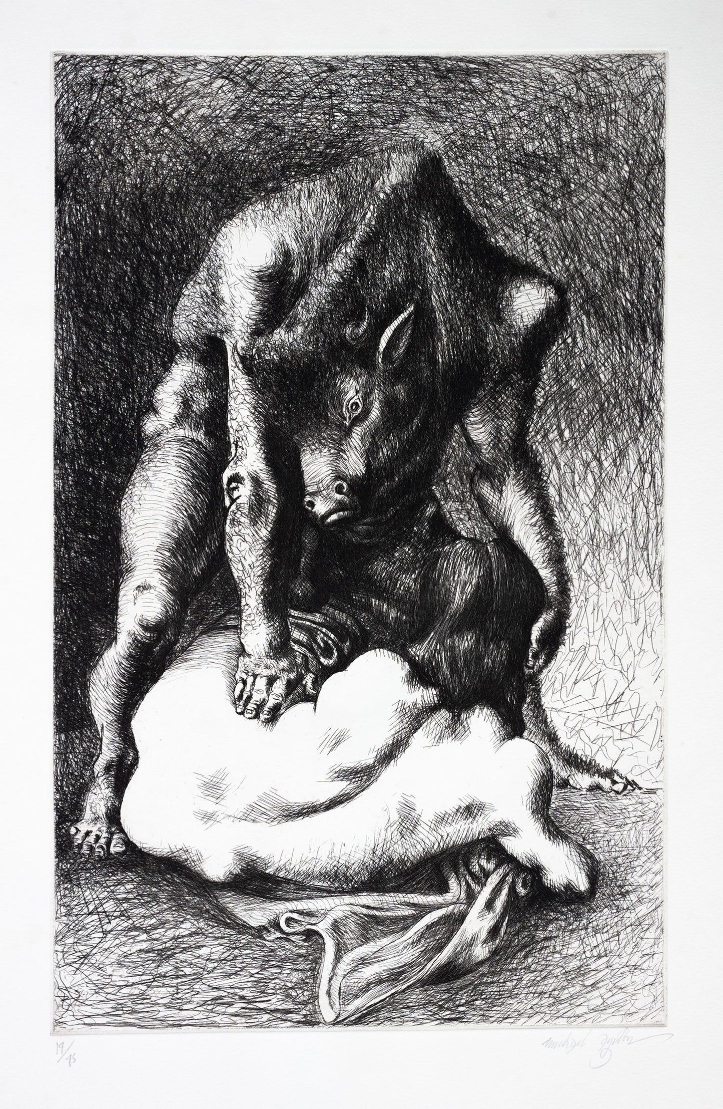 The minotaur was a powerful archetype which occupied Michael Ayrton for over ten years of his artistic life. Beginnning in 1961, Ayrton wrote and created many works associated with the myths of the Minotaur and Daedalus, the legendary inventor and maze builder. Works include bronze sculpture, the autobiographical novel 'The Maze Maker' (1967), and the 'Minotaur' Etchings (1971).