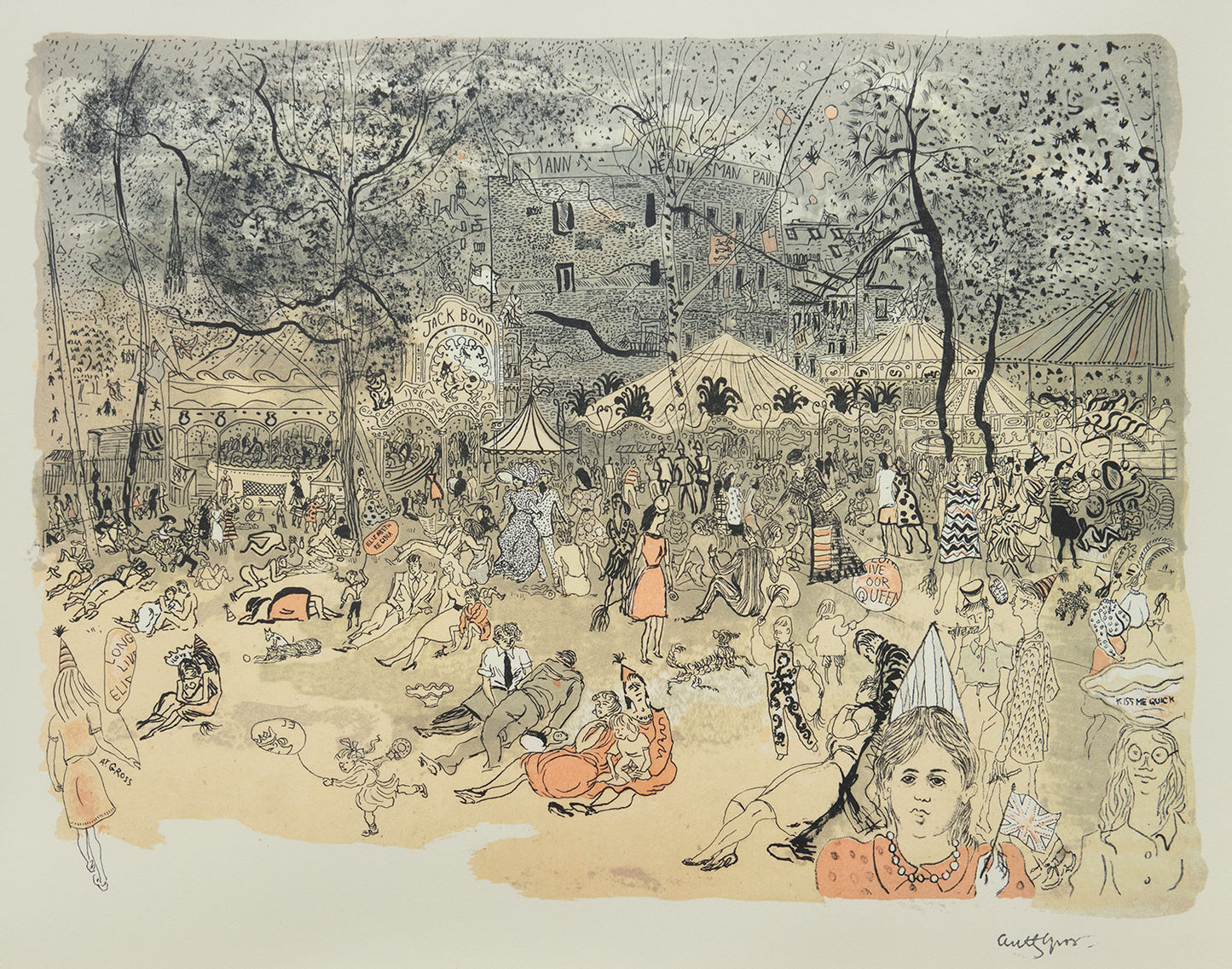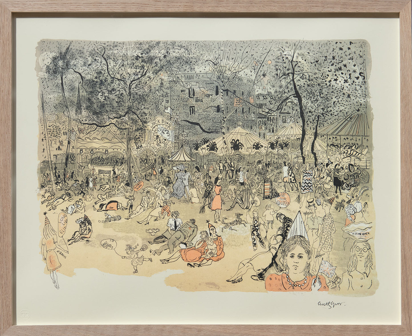 Gross’ Hampstead Heath presented picnickers and fairground-goers in late summer festivities, transforming his original watercolour scene into a Coronation special with added ‘Elizabeth Regina’ and ‘long live our queen’ blazons on the children’s balloons and a tiny Union Jack flag in the foreground.