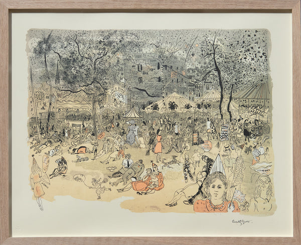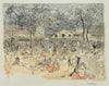 The original painting now resides in the government art collection, allowing us to see the changes Gross made to enliven his lithograph. It is typical of his ‘teeming’ style, where land and cityscape ripple in a sea of inky activity. Here the trees explode into a constellatory shimmer of leaves, dancing like stars or firework squiggles reminiscent of Miró and mirrored in the scattered figures below. Gross’ compositional generosity made for one of the more interesting, and enduring, images of the series – one the Goldmark Gallery are delighted to be reviving.