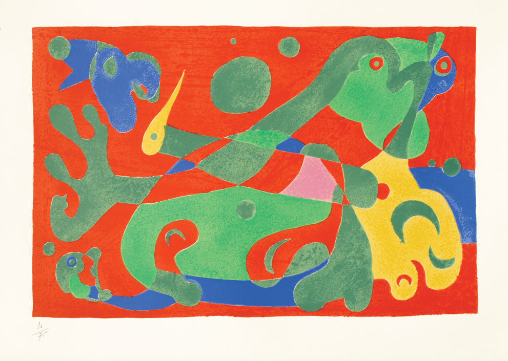 Drawing on his universe of signs and symbols, he was able to create a world populated by strange configurations in vivid colours. He made many prints throughout his career and in 1954 he was given the Venice Biennale print making prize. The Foundation Joan Miró was opened in 1975 overlooking Barcelona. He died in 1983.