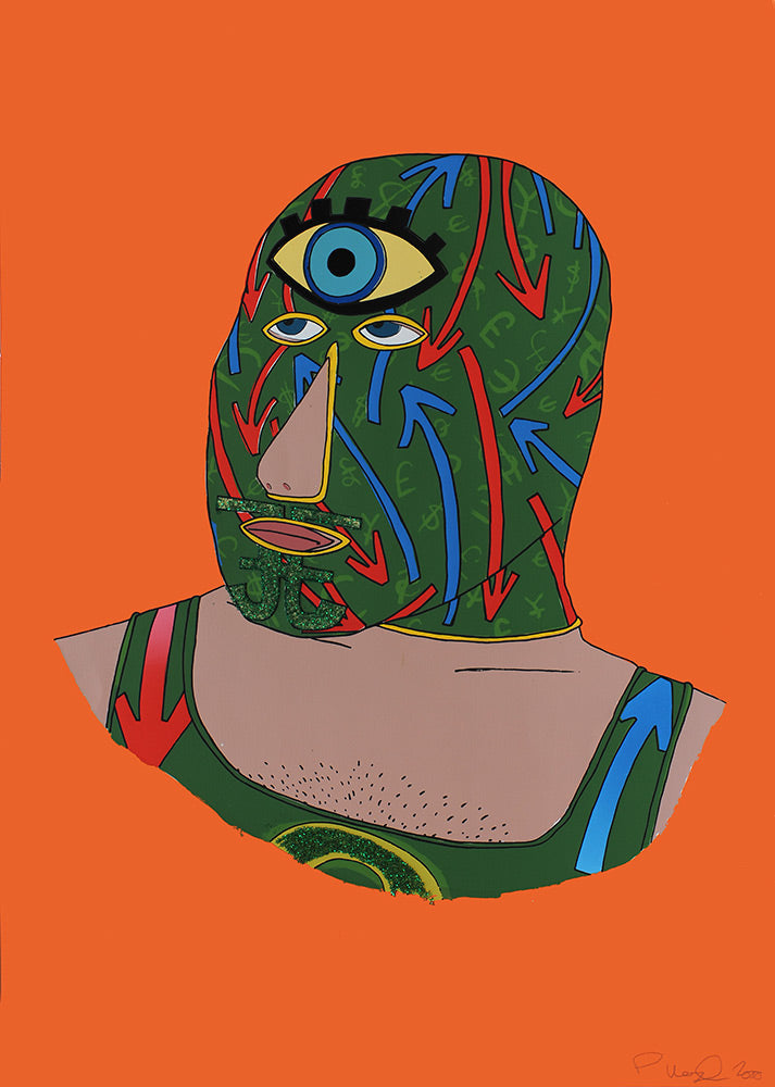 While in Mexico, however, Lloyd discovered the ‘Lucha Libra’ wrestling culture. The wrestlers expressed traditional values, folkloric traditions, mass entertainment and political activism, which Lloyd felt was missing from the festival he had originally been to see. This led to him to make this series of screenprints which incorporate Mexican culture and fine art.