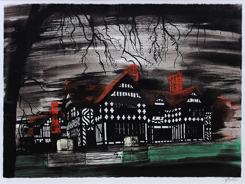 John Piper was born at Epsom in Surrey, 1903. Following his father’s wishes, he spent 5 years in the family law firm before pursuing art, firstly at Richmond School of Art and then at the Royal College of Art. In the 1930s Piper exhibited abstract pictures and constructions, then reverted to creating landscape and architectural images, developing the picturesque style that features in his later work.