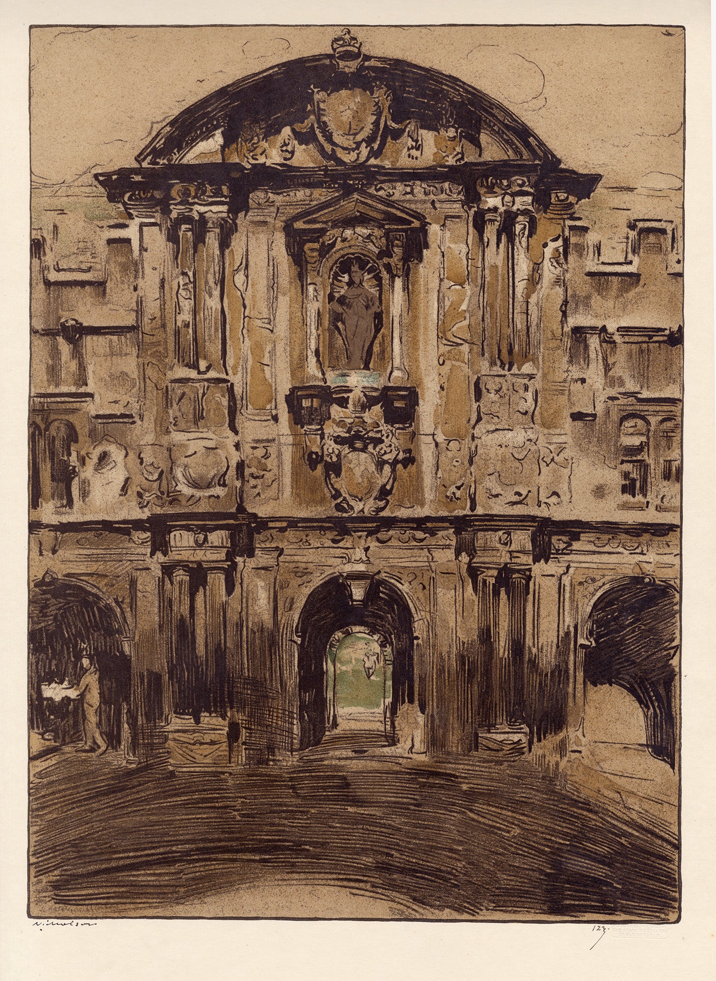Signed lithograph after watercolours Nicholson made of Oxford. Printed at The Ballantyne Press, London.Published 1905 by the Stafford Gallery, with accompanying blind stamp.