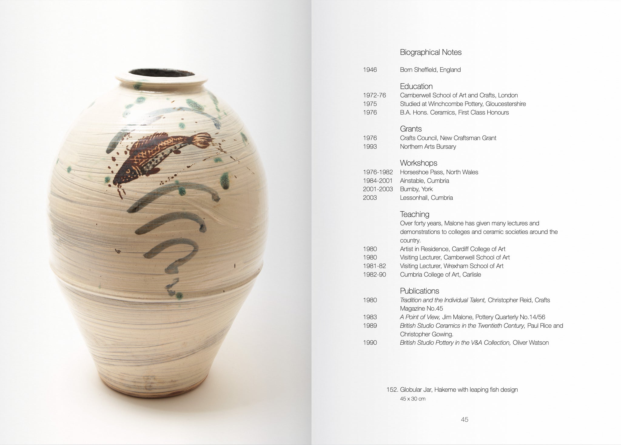 Malone has had articles published in Pottery Quarterly and Ceramic Review and has exhibited widely throughout the UK and USA. His pots can be found in the collections of the V&A; Ulster Museum, Ireland; Manchester Metropolitan University; Liverpool Museum and Art Gallery to name but a few.