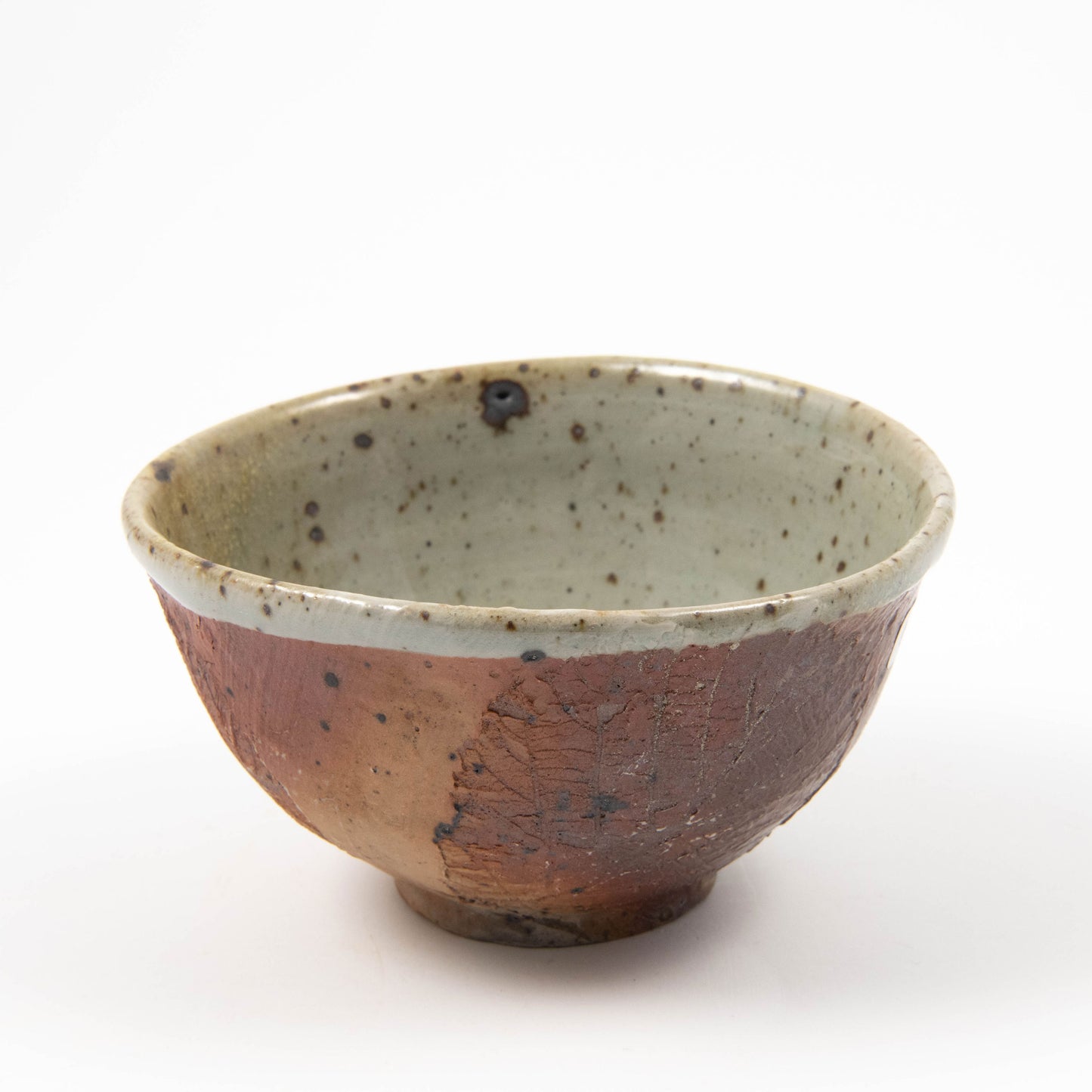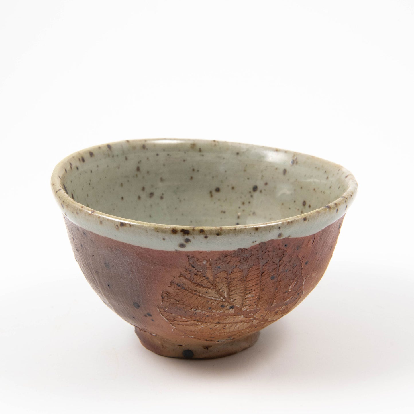 Leaf impressions. Brushed shino outside, celadon inside with natural ash