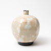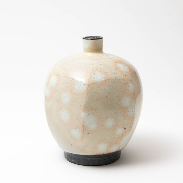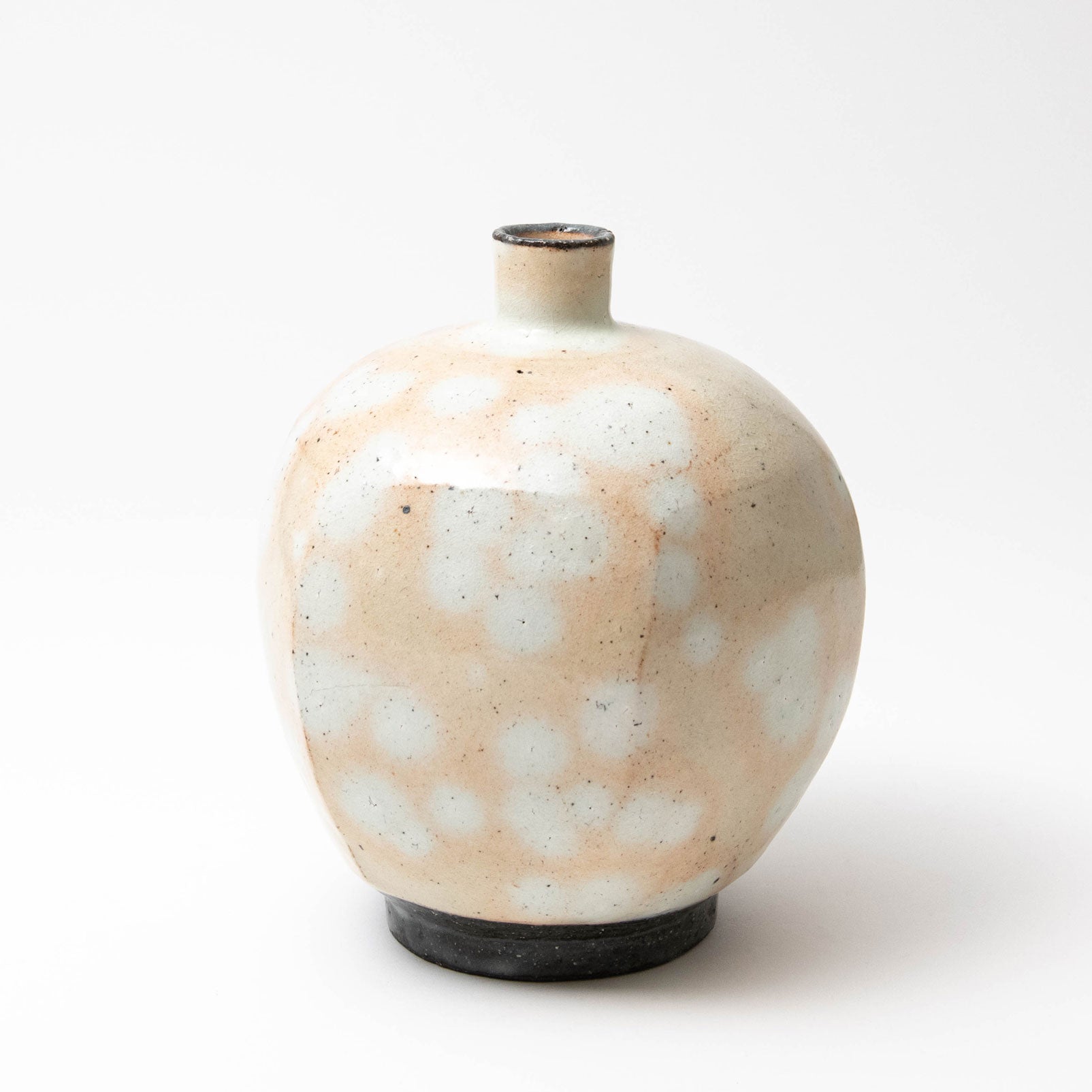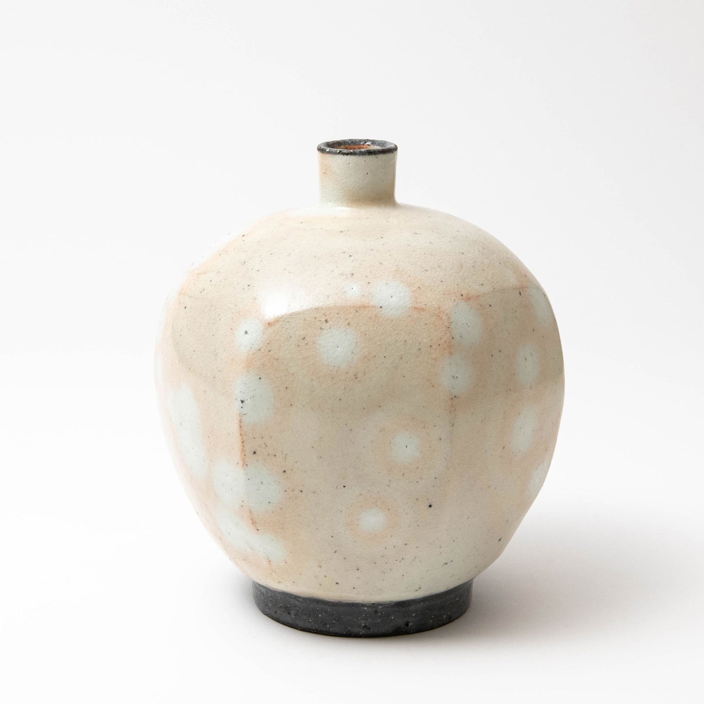 Lee decorates his pots using the traditional Korean method of Punch'ŏng. White slip is applied to a dark stoneware body. Spread with his hands, and incised with tools.