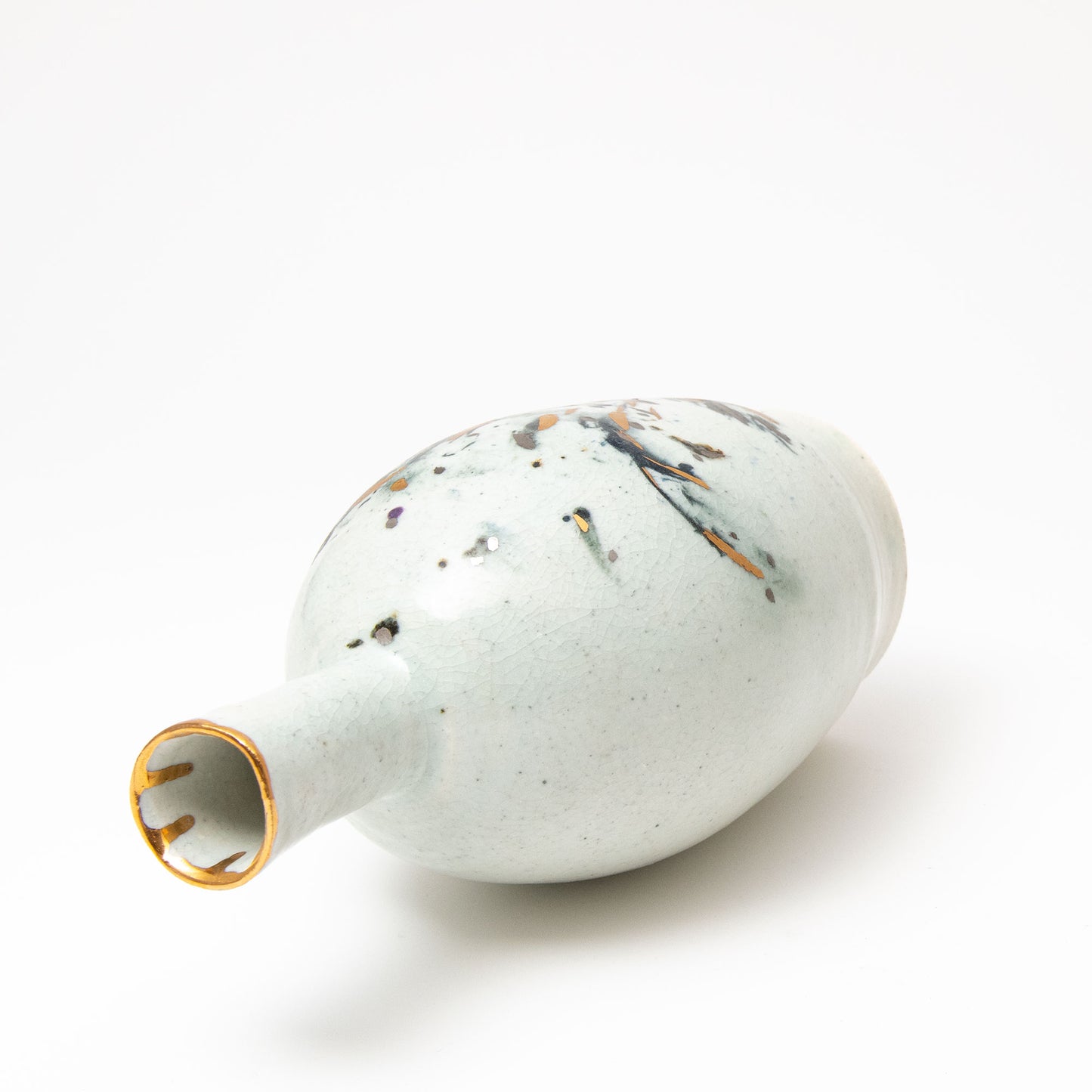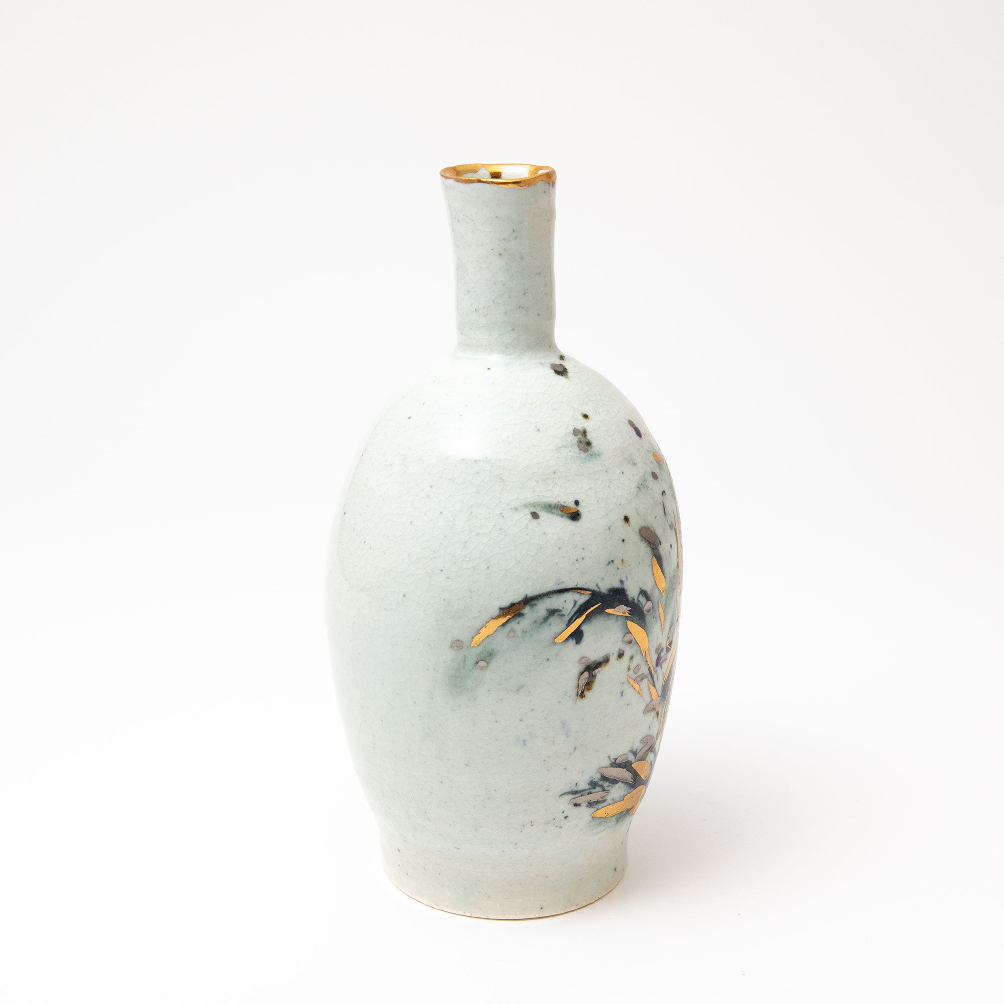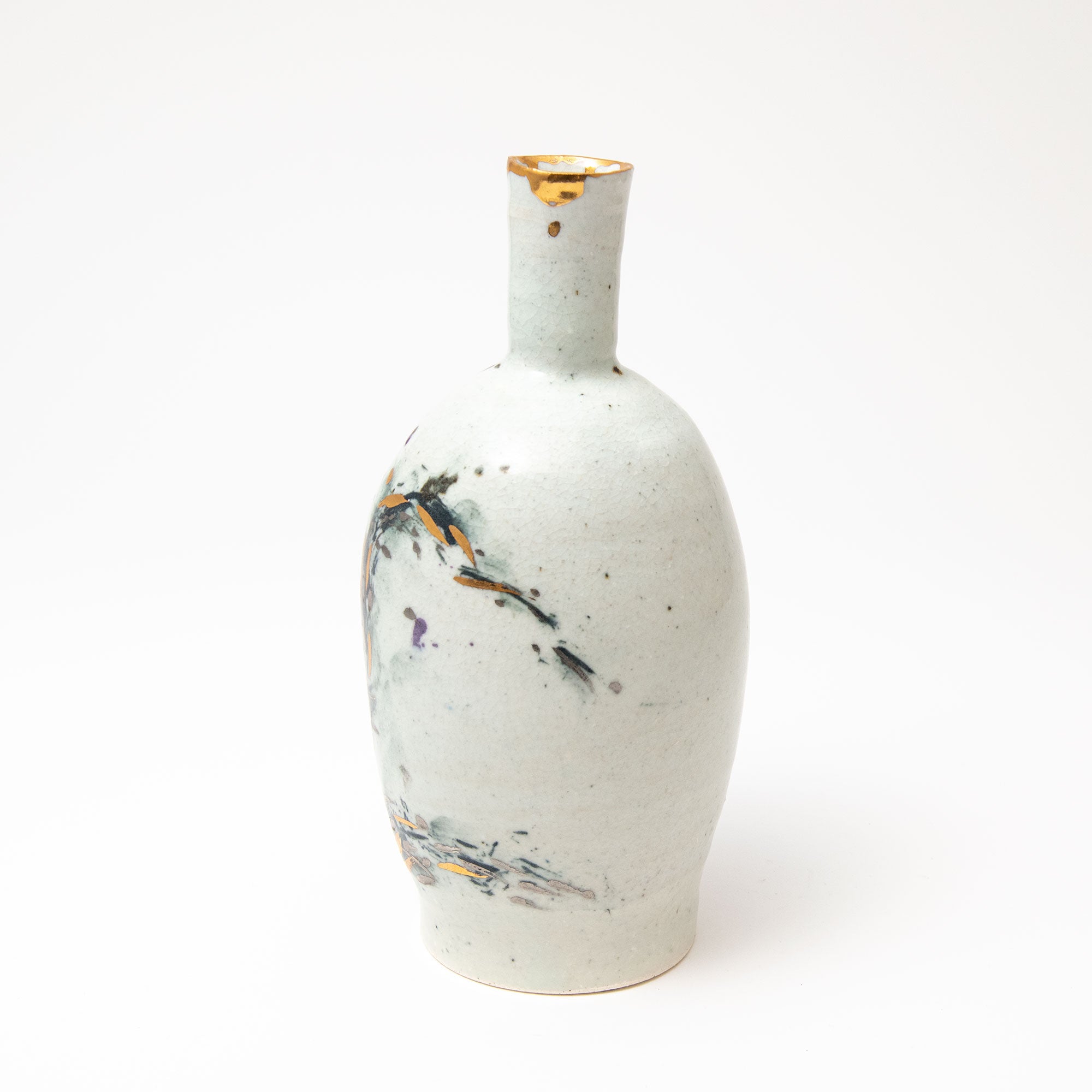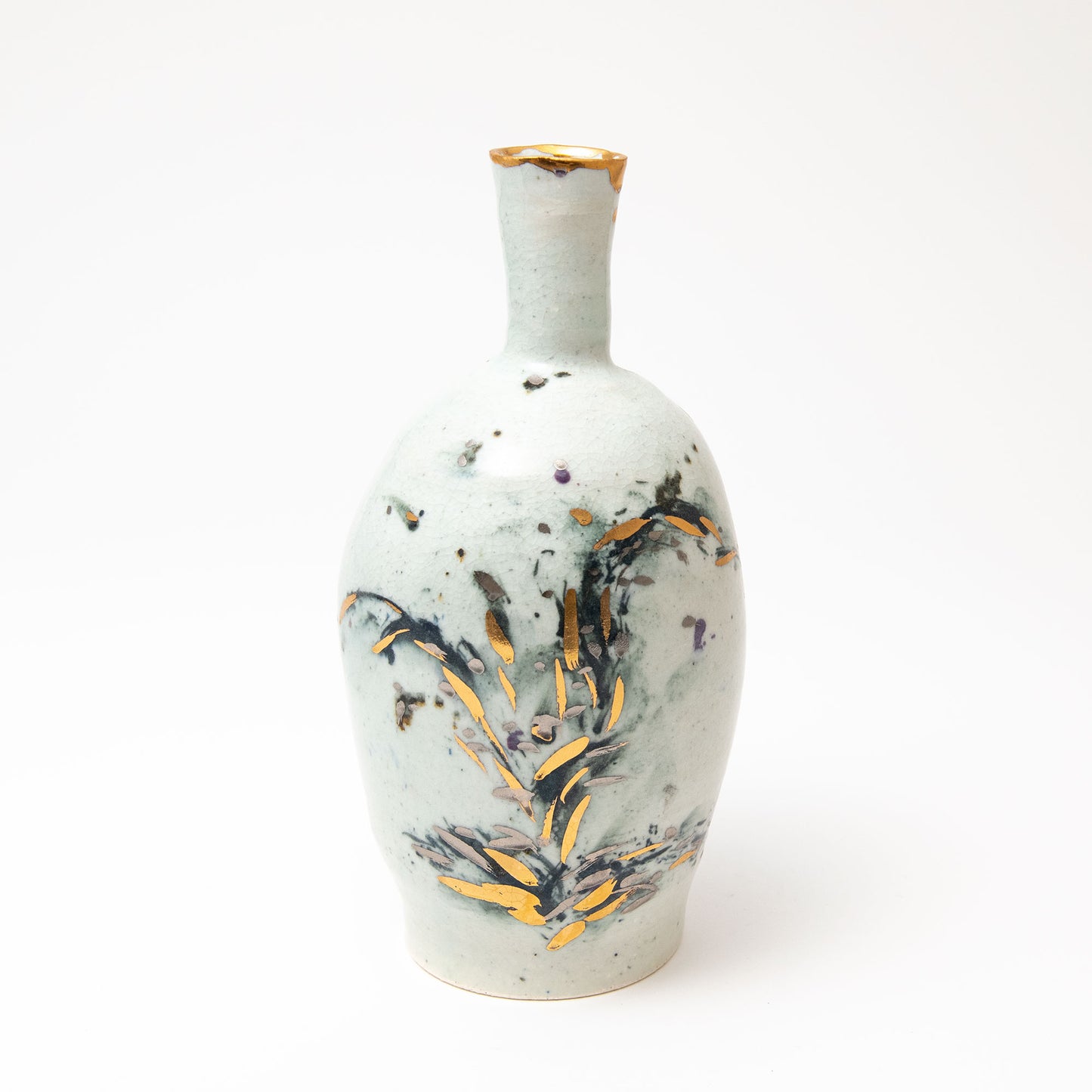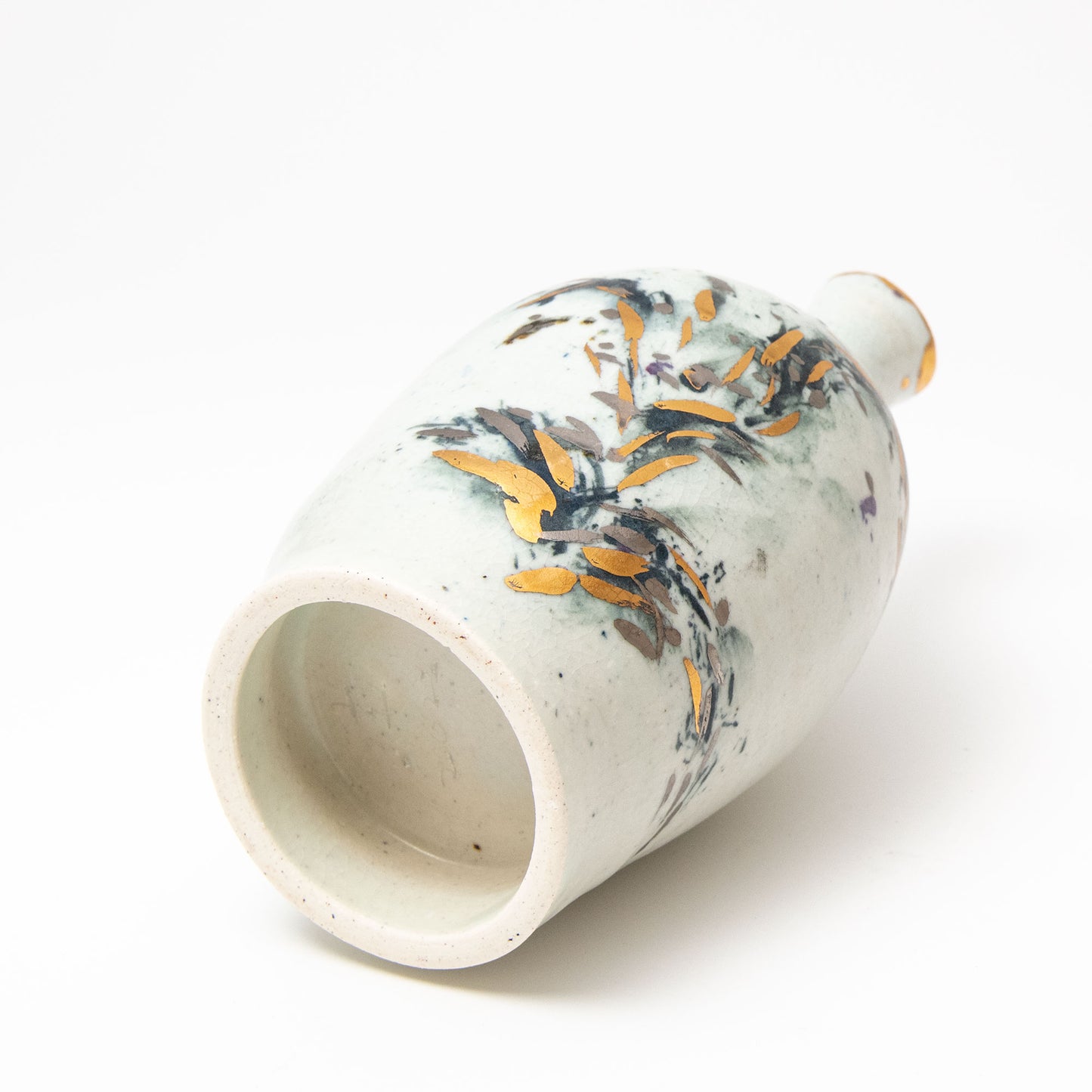 Porcelain body with cobalt & black pigments applied. After the first high temperature firing for the porcelain glaze, the gold & silver are applied and the pot fired again at approximately 700° in a lower temperature luster firing.