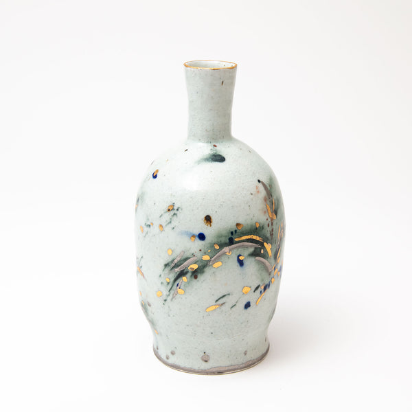 Porcelain body with cobalt & black pigments applied. After the first high temperature firing for the porcelain glaze, the gold & silver are applied and the pot fired again at approximately 700° in a lower temperature luster firing.