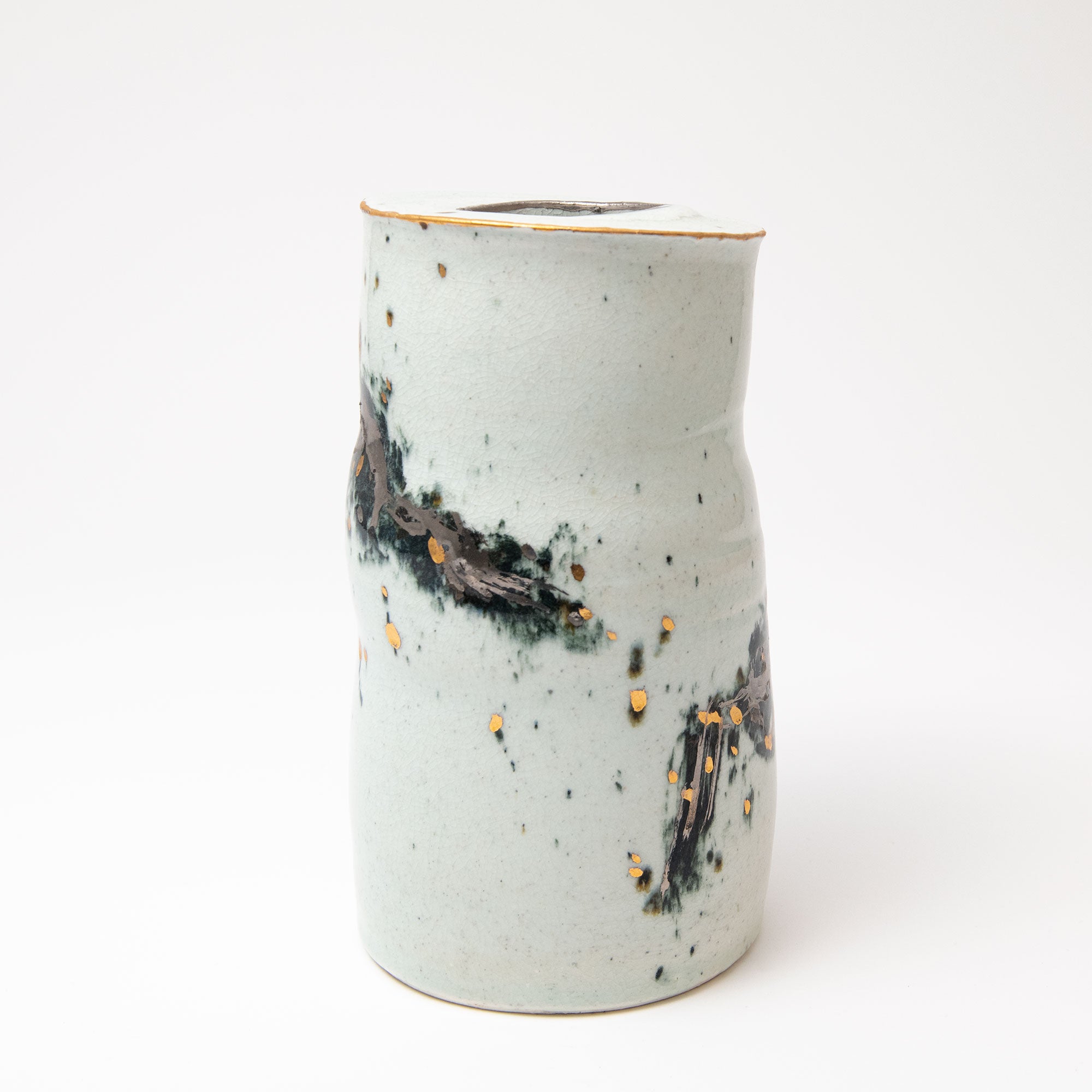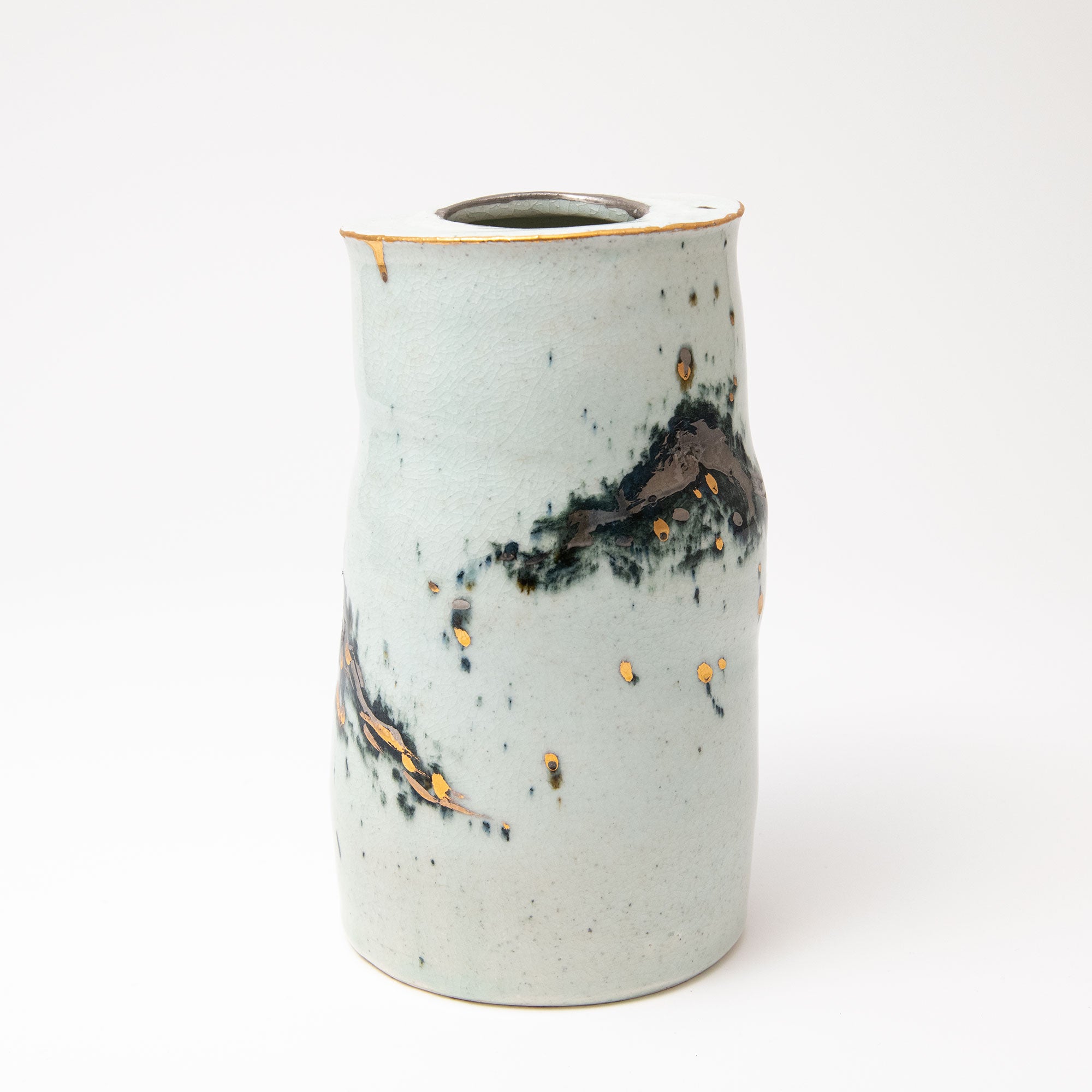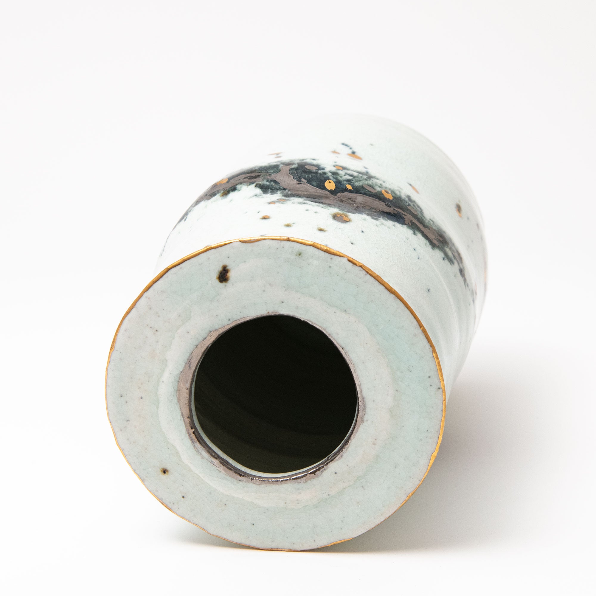 Porcelain body with cobalt & black pigments applied. After the first high temperature firing for the porcelain glaze, the gold & silver are applied and the pot fired again at approximately 700° in a lower temperature luster firing.
