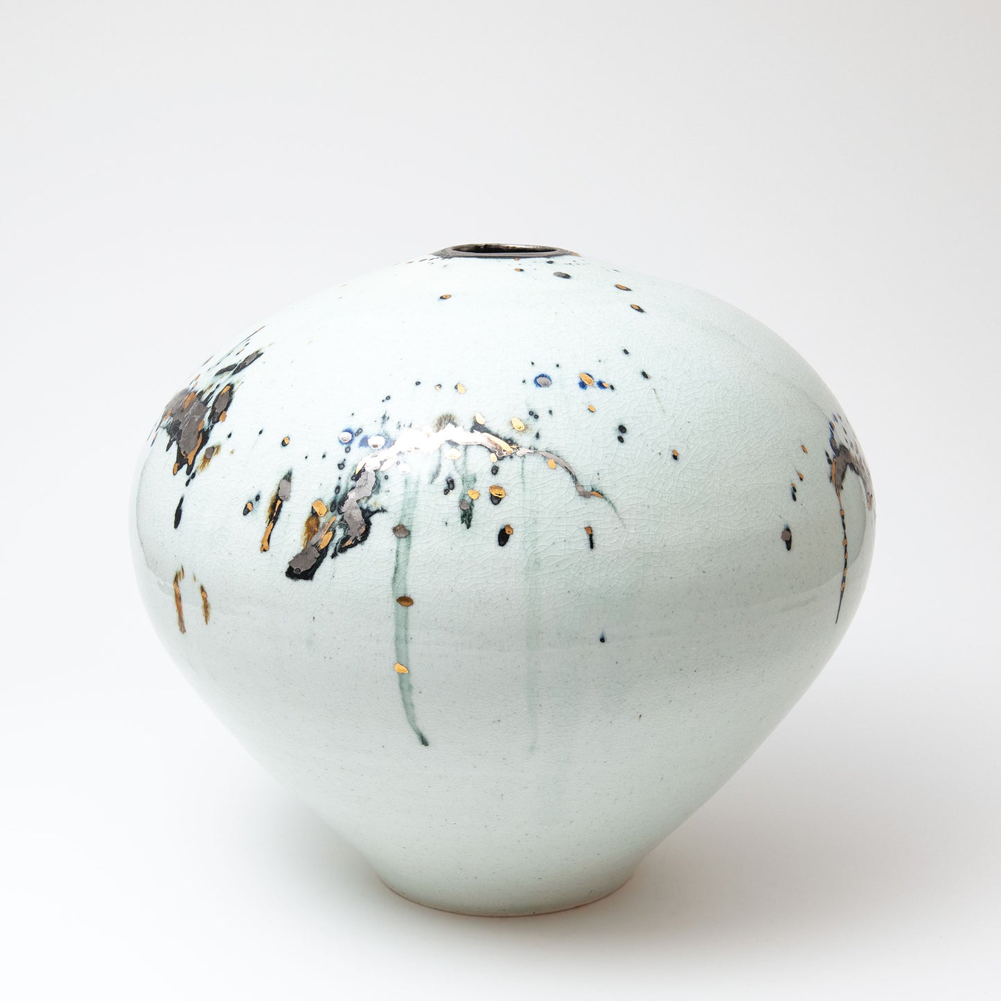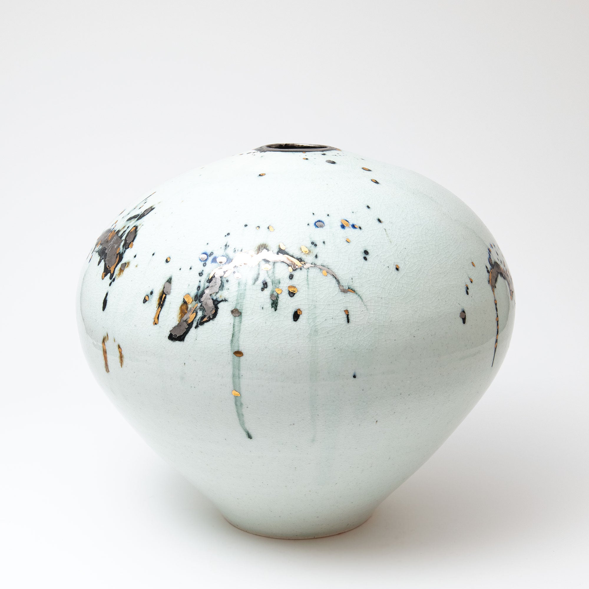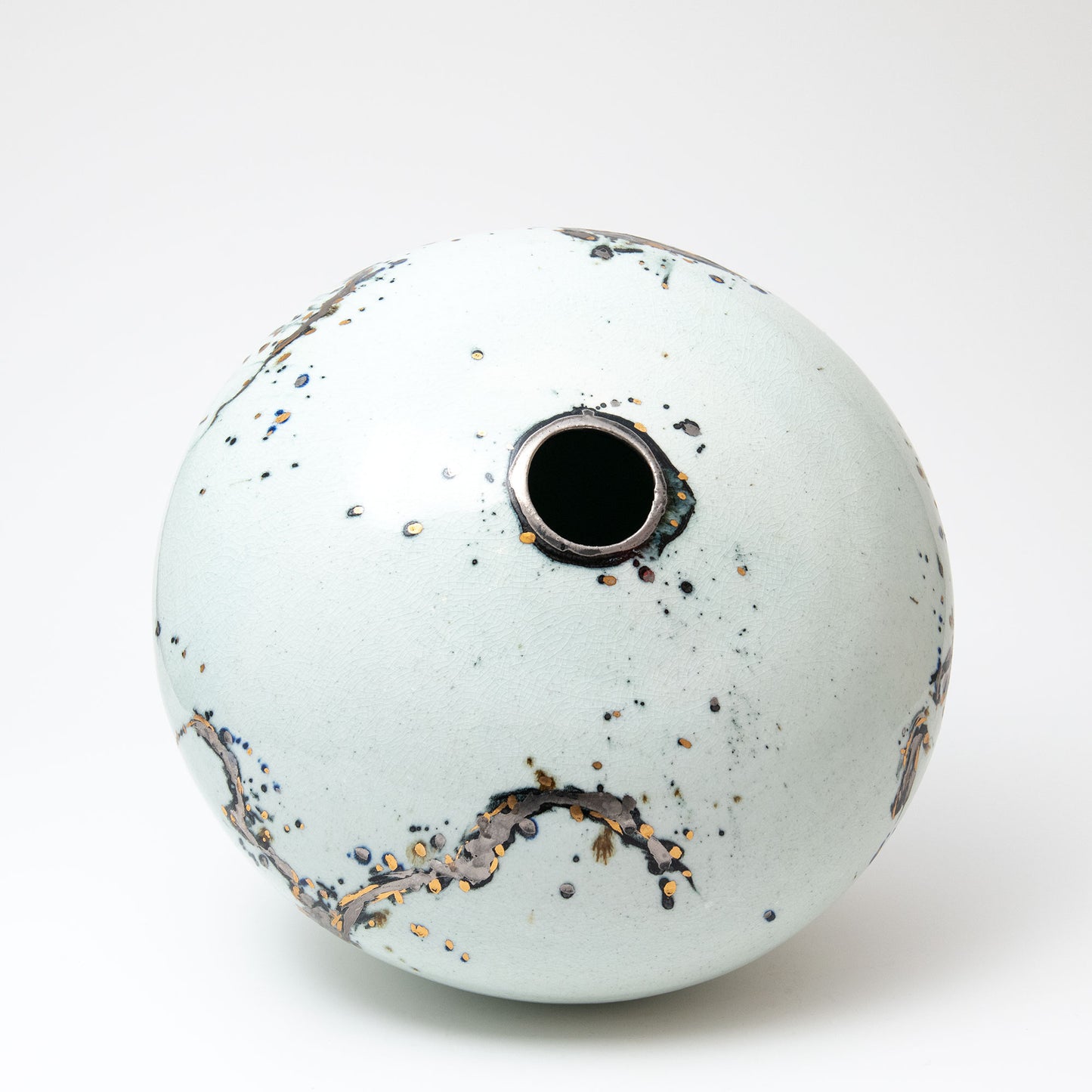 Porcelain body with cobalt & black pigments applied. After the first high temperature firing for the porcelain glaze, the gold & silver are applied and the pot fired again at approximately 700° in a lower temperature luster firing.