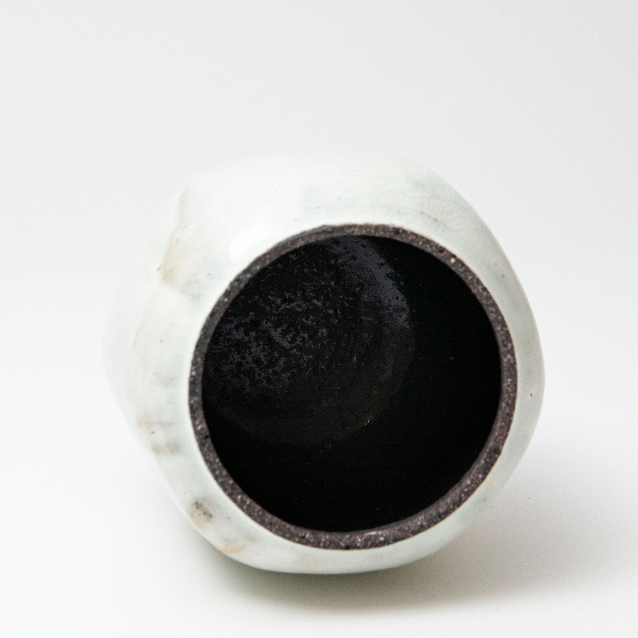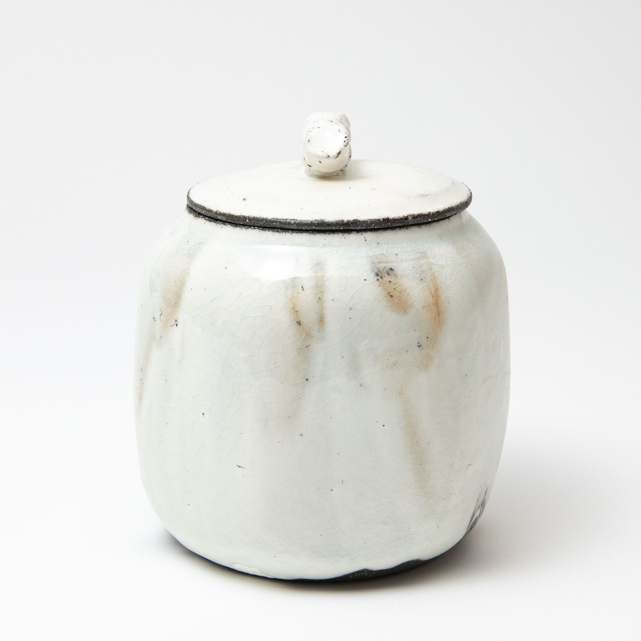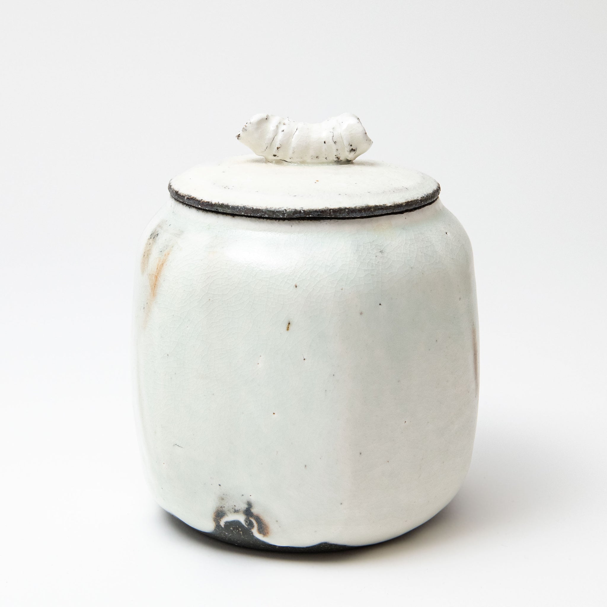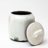 Lee decorates his pots using the traditional Korean method of Buncheong. White slip is applied to a dark stoneware body. Whilst it is still wet Lee uses his hands to spread it over the pot.