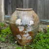 Scallop shells are used during firings to prevent pots sticking to the kiln and to each other. Burning away during the firing they leave behind fossil like scars. This pot was laid face down on top of the shells during firing. The fly ash settled on the exposed surface (what is now the 'back' of the pot), melting to form a natural ash glaze which upon cooling hardened into glassy rivulets .