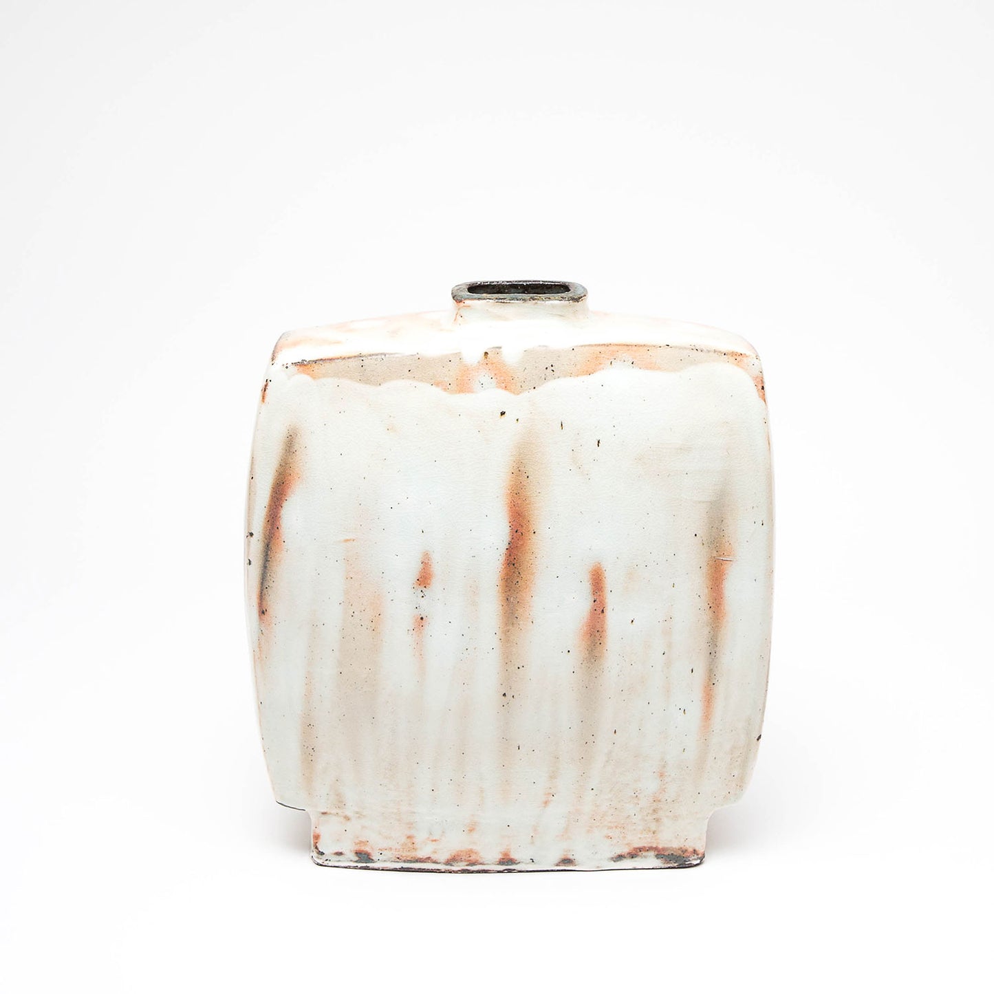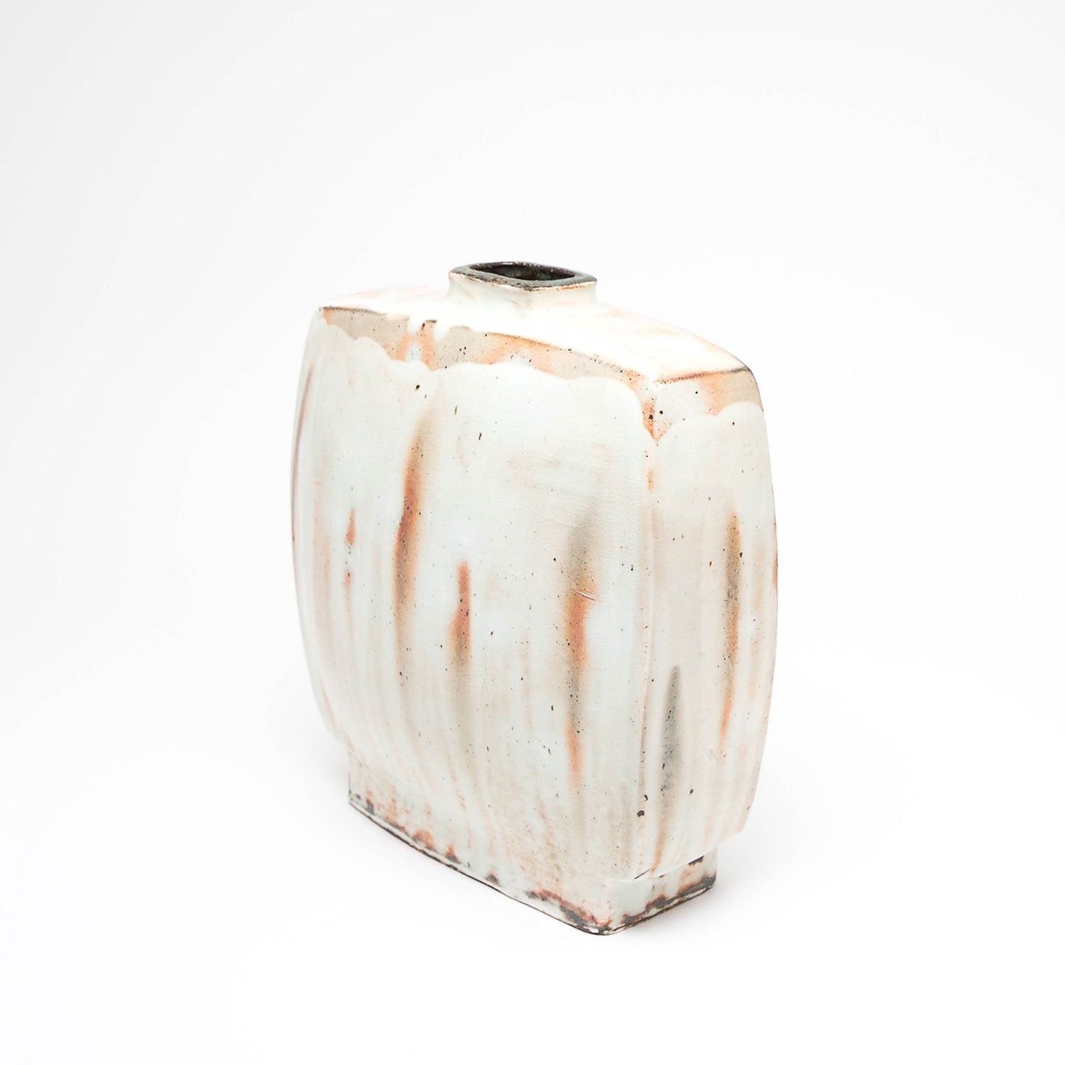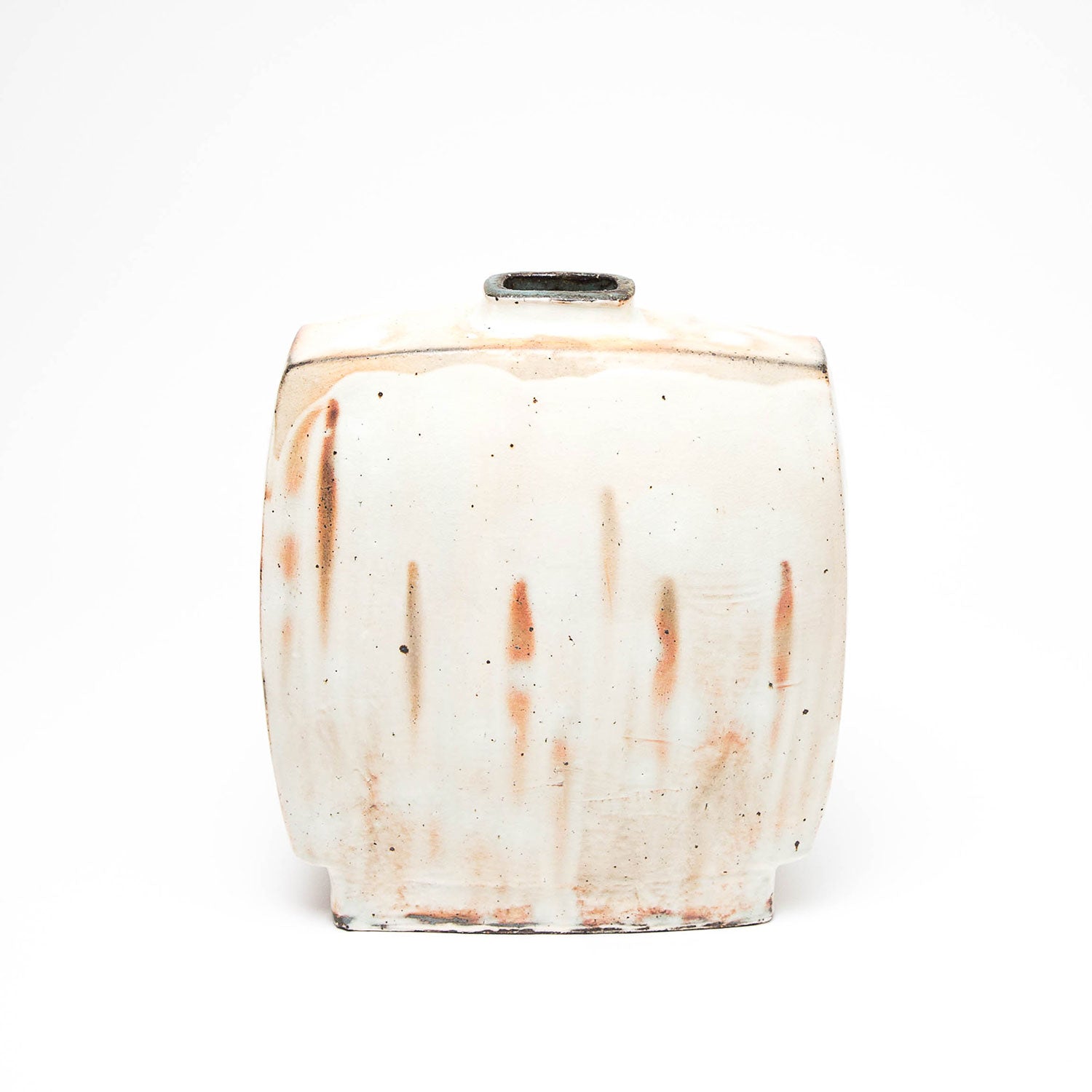 Lee decorates his pots using the traditional Korean method of Punch'ŏng. White slip is applied to a dark stoneware body. Spread with his hands, and incised with tools.