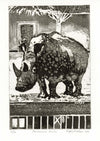 The rhino reproduced here, etched with aquatint by Rigby Graham, is the 20th century successor to Jan Wandelaar's 18th century engraving. It portrays one of the Northern White Rhinos introduced to West Berlin Zoo in 1963 from the Hluhluwe–Imfolozi reserve in South Africa. Today, the Northern White Rhino is now ‘functionally extinct’; there are only two females left, making it the most endangered mammal on earth. Unwittingly, Graham’s image depicts the last of its kind.