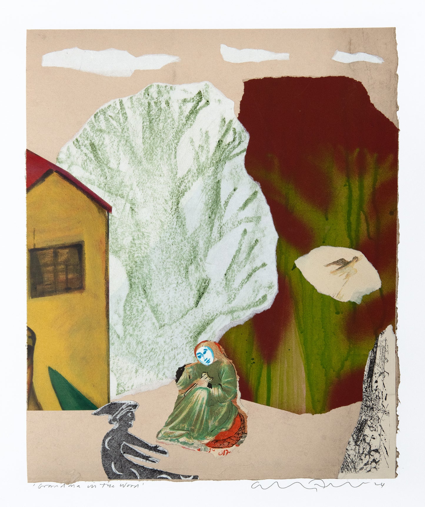Collage includes found papers, painted and printed material by Wood and characters from cut down etchings that the artist has made for the series.