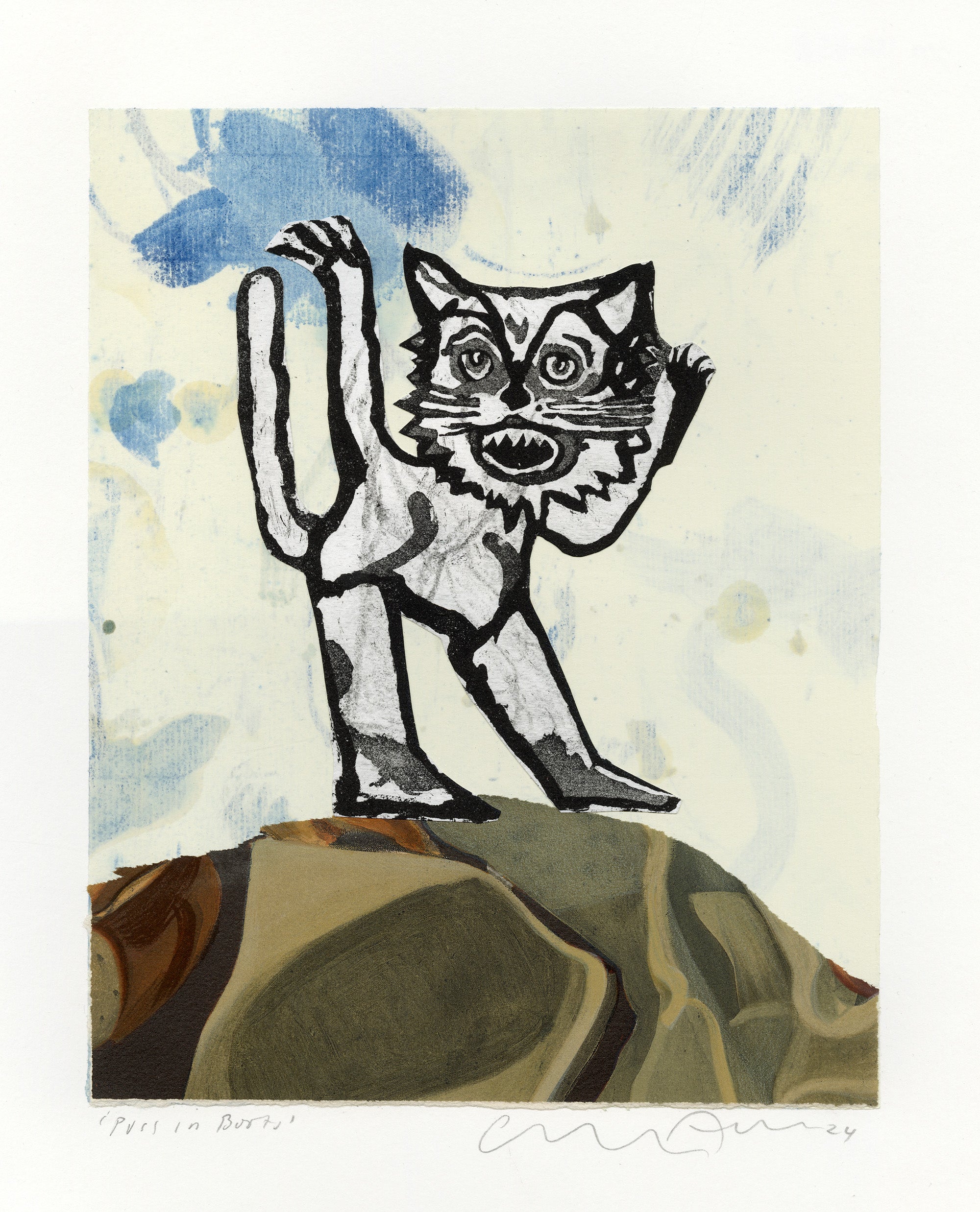 Collage includes found papers, painted and printed material by Wood and characters from cut down etchings that the artist has made for the series.