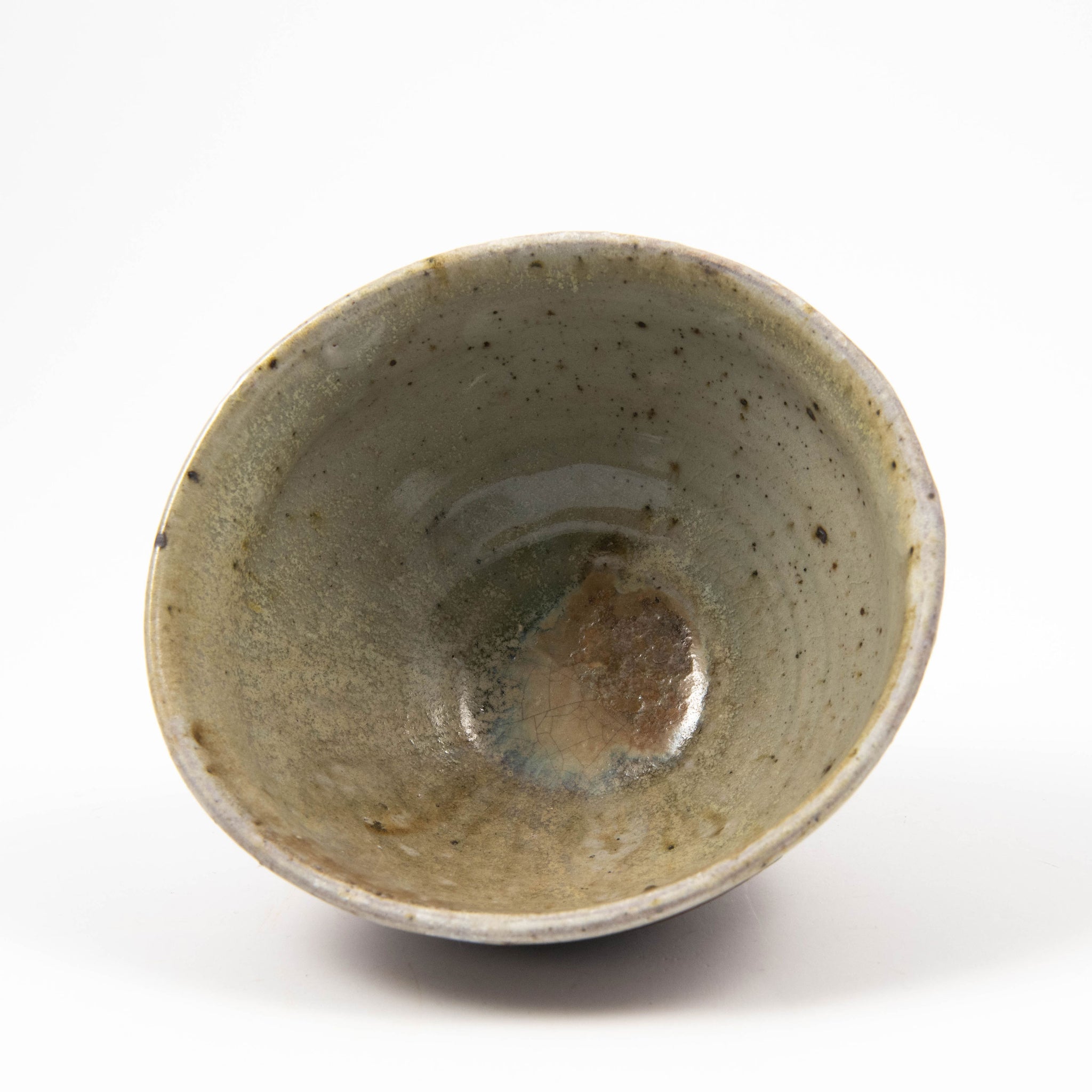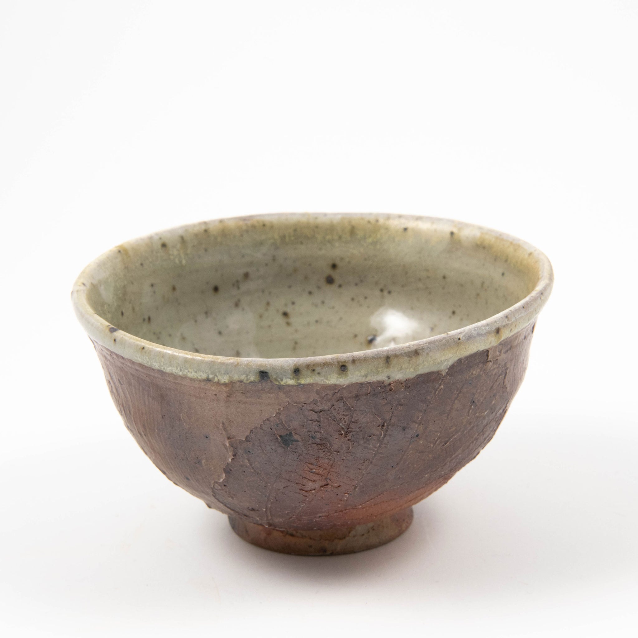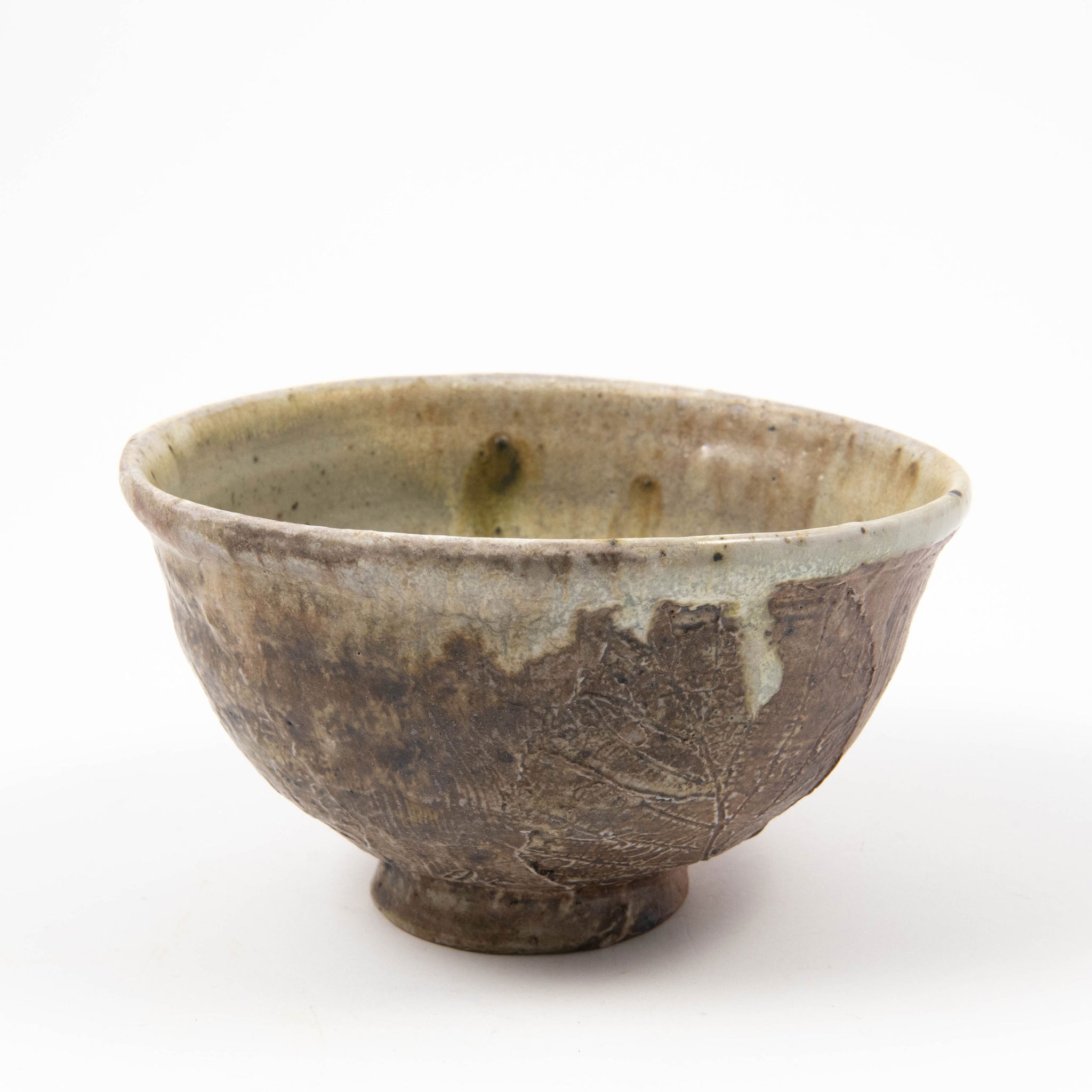Leaf impressions. Brushed shino outside, celadon inside with natural ash