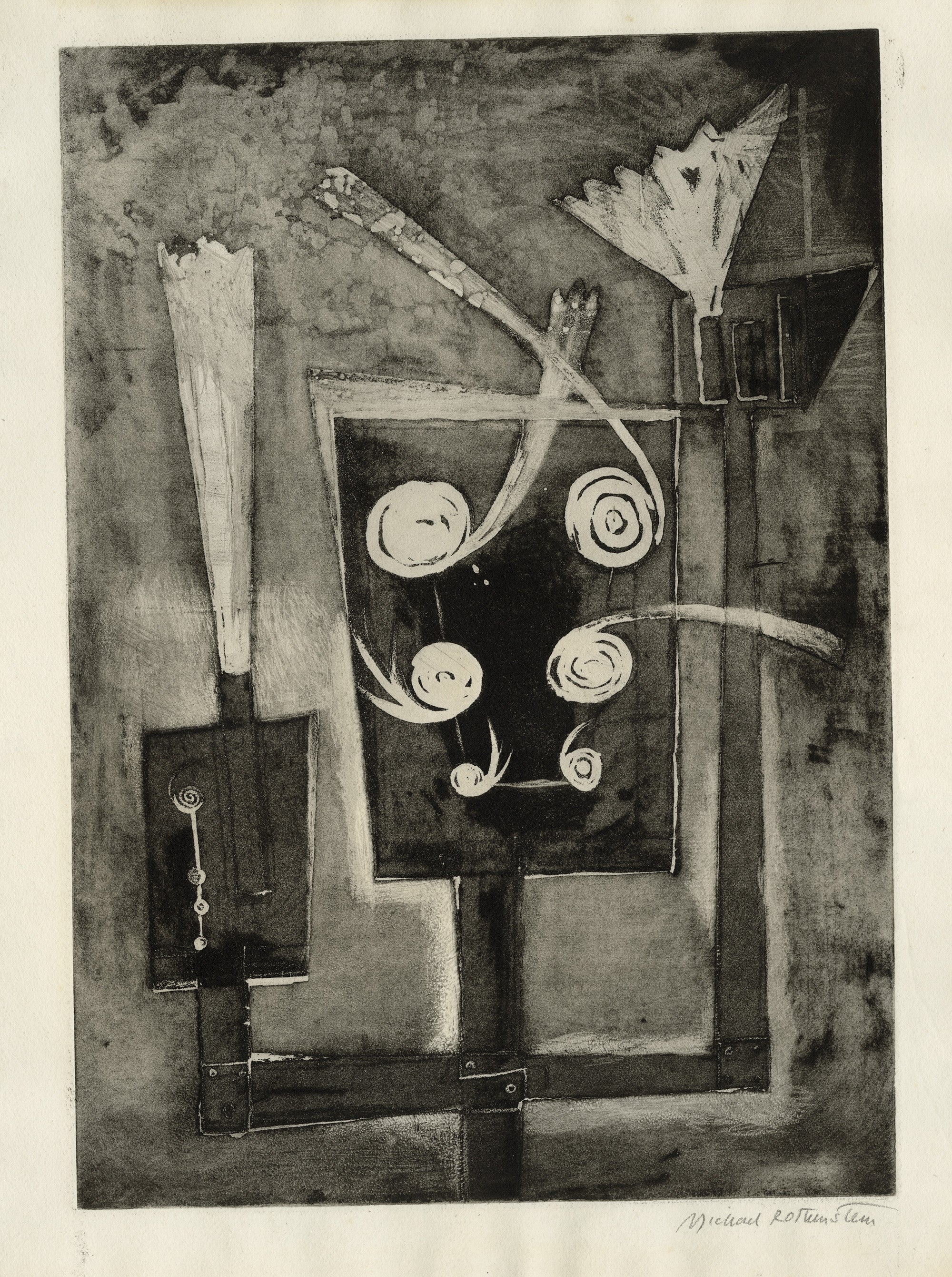 Rothenstein became one of the most experimental printmakers in Britain during the ‘50s and ’60s. As well as found objects such as wood offcuts and metal debris, he incorporated fresh 20th century imagery into his relief prints, combining photographic material with traditional woodcuts and linocuts. Numerous major galleries currently hold his work and he was made Hon. RE and elected RA in 1983.