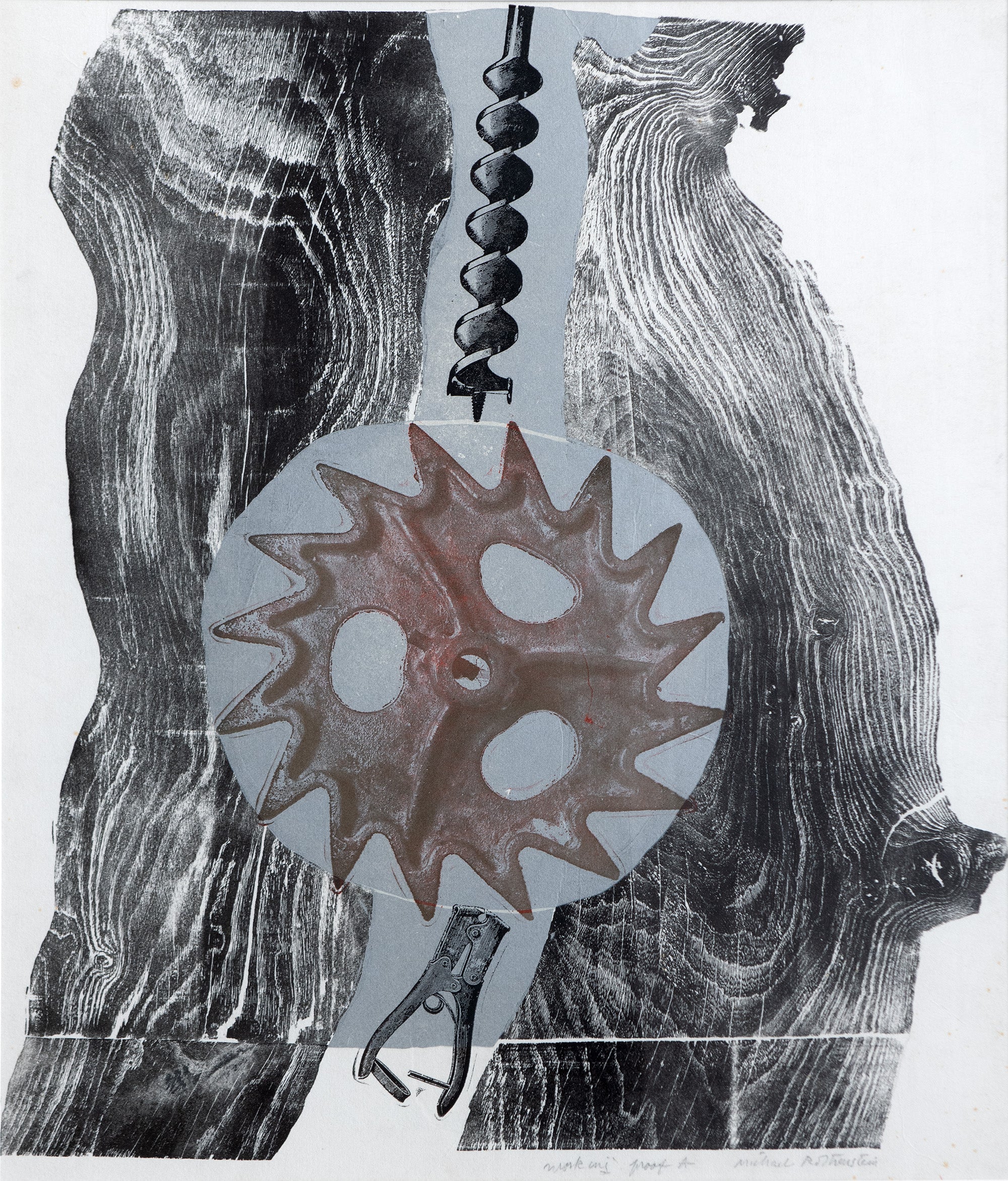 Rothenstein became one of the most experimental printmakers in Britain during the ‘50s and ’60s. As well as found objects such as wood offcuts and metal debris, he incorporated fresh 20th century imagery into his relief prints, combining photographic material with traditional woodcuts and linocuts. Numerous major galleries currently hold his work and he was made Hon. RE and elected RA in 1983.