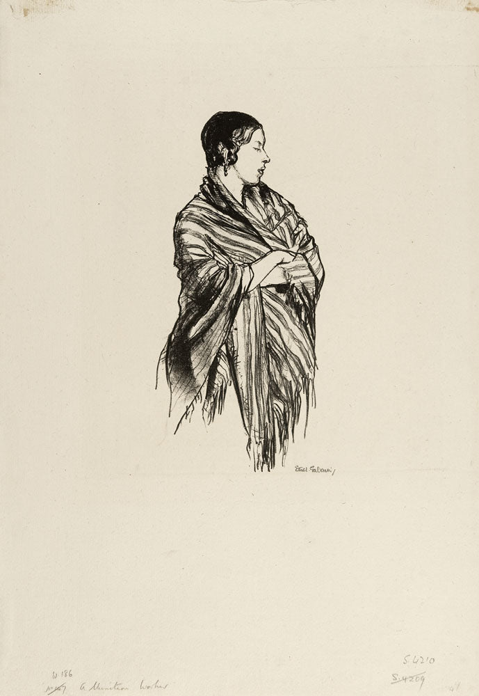 Early in her career Gabain decided to concentrate largely upon lithography, her subjects often lone girls or women in domestic interiors, usually working in black and white and occasionally employing colour to highlight details. During World War II Gabain was appointed an Official War Artist and her lithographs continued to be purchased until the end of the war. She died in 1950.