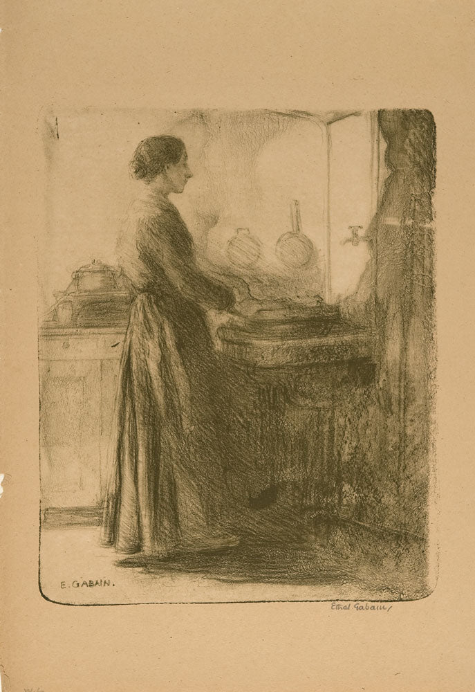 Early in her career Gabain decided to concentrate largely upon lithography, her subjects often lone girls or women in domestic interiors, usually working in black and white and occasionally employing colour to highlight details. During World War II Gabain was appointed an Official War Artist and her lithographs continued to be purchased until the end of the war. She died in 1950.