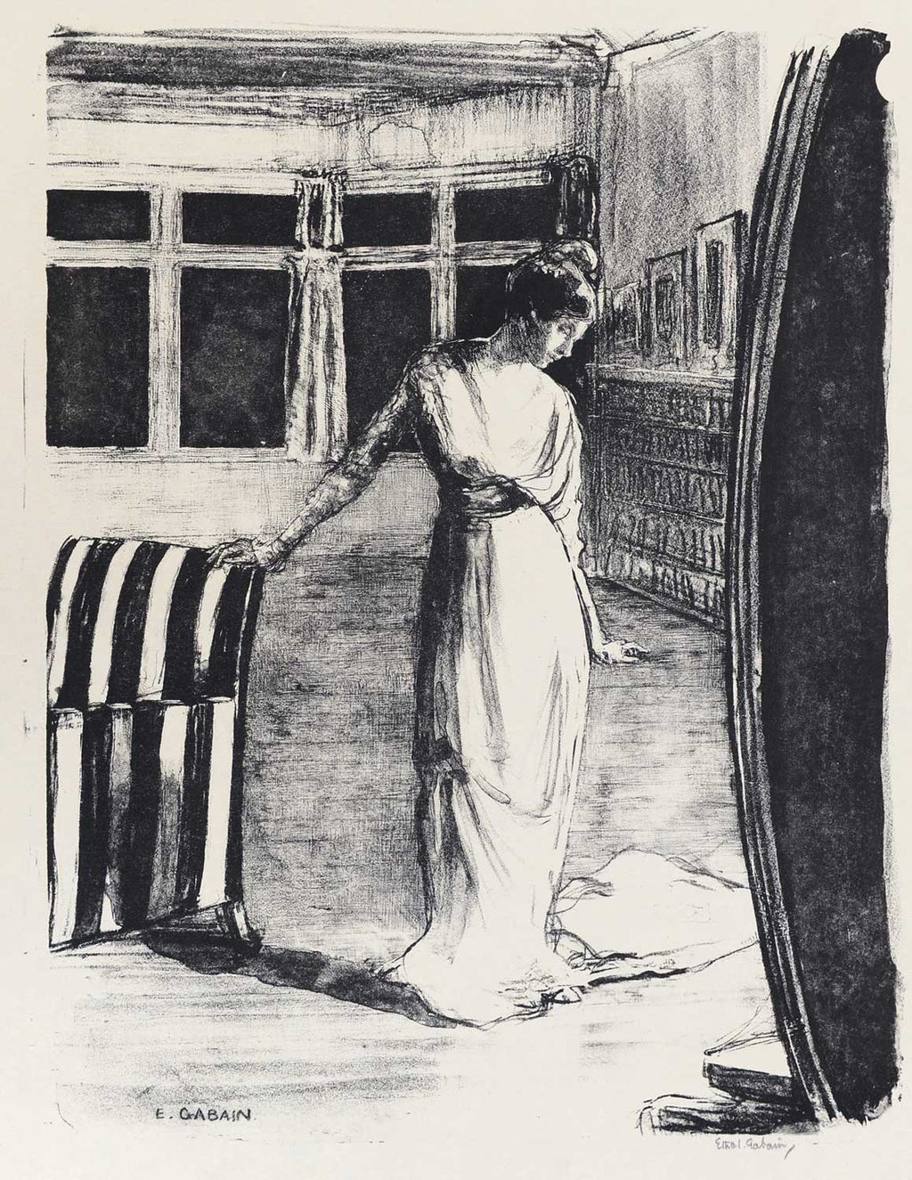 Early in her career Gabain decided to concentrate largely upon lithography, her subjects often lone girls or women in domestic interiors, usually working in black and white and occasionally employing colour to highlight details. During World War II Gabain was appointed an Official War Artist and her lithographs continued to be purchased until the end of the war. She died in 1950.