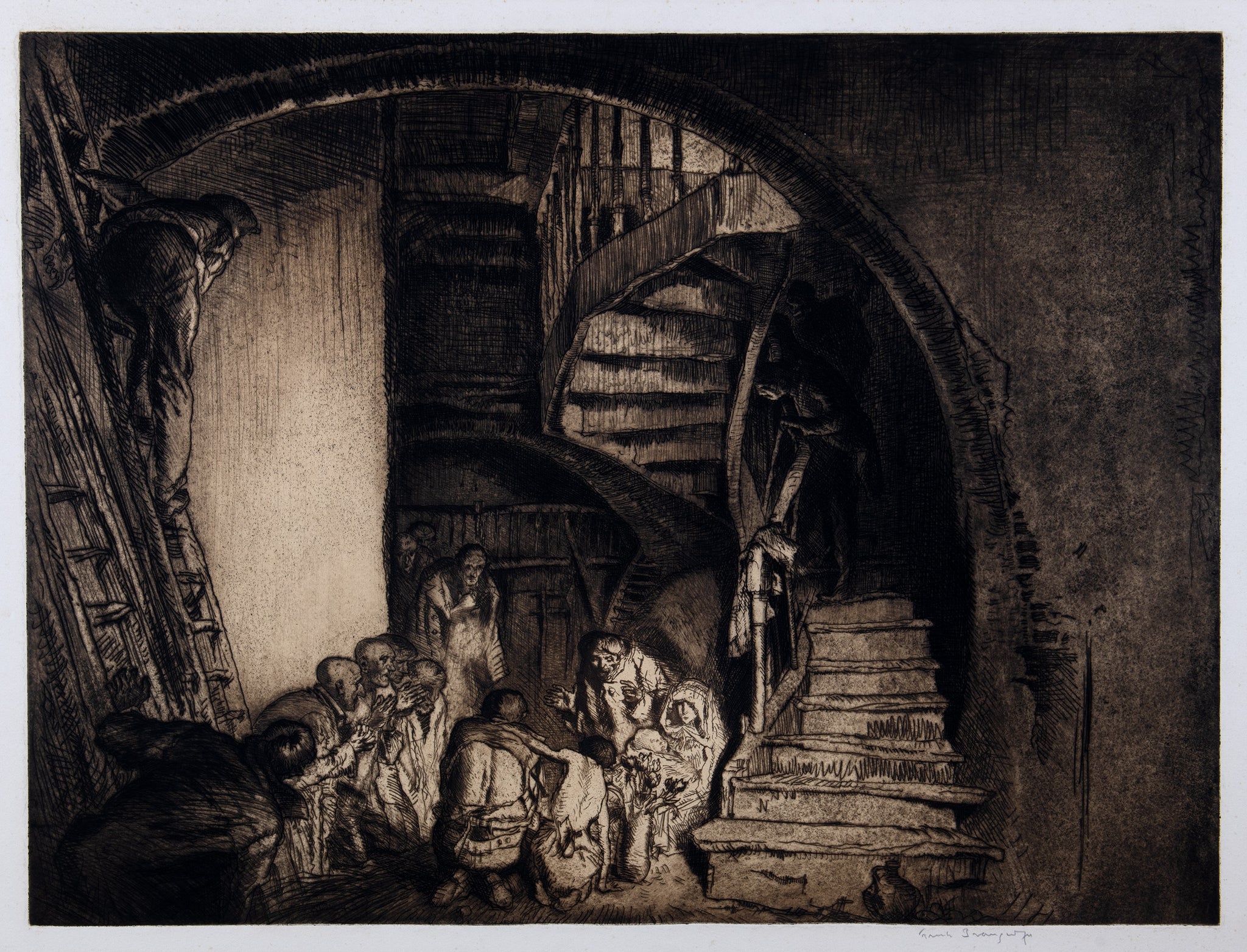 In the 1900s Brangwyn began designing furniture, textiles, ceramics and other media. He was made an Official War artist in World War I, gaining repute through his posters, and was further recognised with an RA appointment (1919) and a knighthood (1941). Brangwyn was given a major retrospective exhibition at the Royal Academy, the first time this honour had been accorded to a living artist.