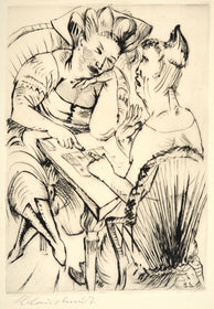 German Expressionism was borne on a wave of resistance and reaction. At its core it was concerned with emotion and the individual experience. This scene is typical in subject matter featuring two elderly ladies, one having her fortune read with unflinching and unflattering detail.