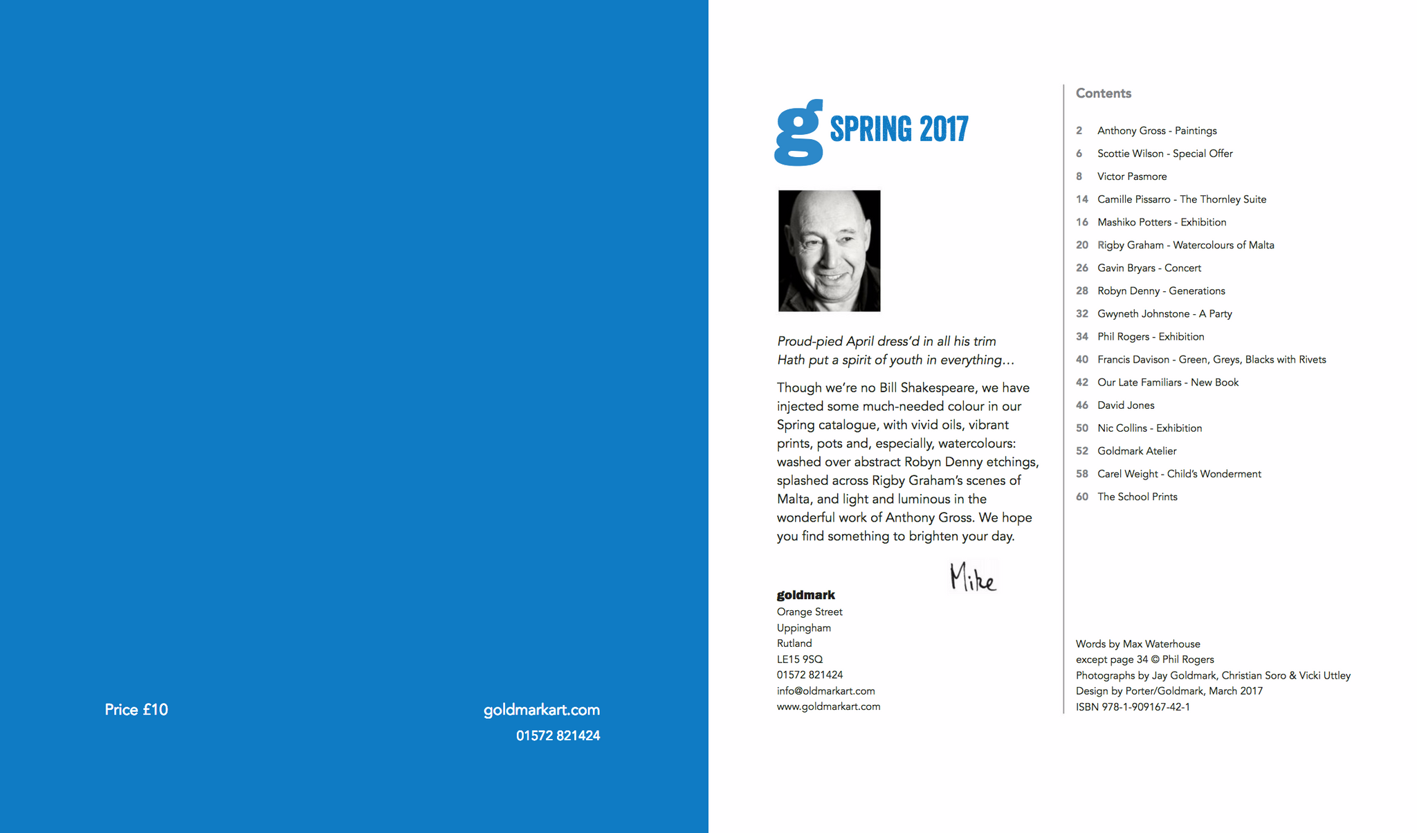Features on Anthony Gross, Scottie Wilson, Victor Pasmore, Camille Pissarro, the Japanese pottery town of Mashiko, Rigby Graham's Maltese watercolours, news of Gavin Bryars Ensemble concert, Robyn Denny, Gwyneth Johnstone, Phil Rogers exhibition, Francis Davison collage, a new book from Goldmark written by Iain Sinclair and illustrated by Ian Wilkinson, David Jones, Nic Collins news, an article on the Goldmark Atelier, a Carel Weight feature and a piece on the 1940s School Prints.