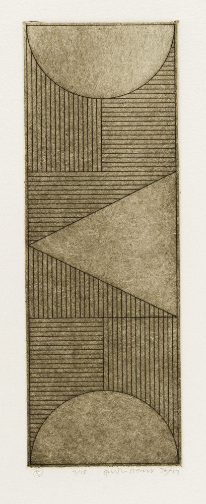 This suite of etchings, begun in 1973 uses various combinations of three elements: the triangle, arc and semi-circle; all set within a rigid grid formation.