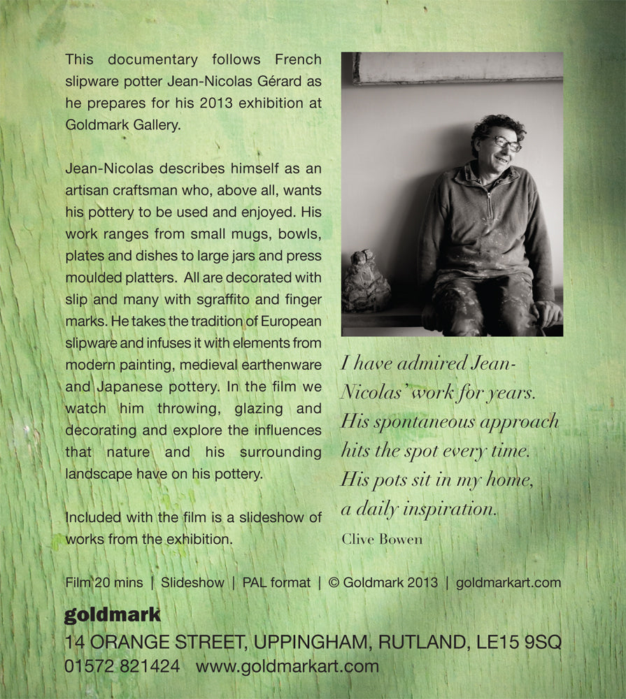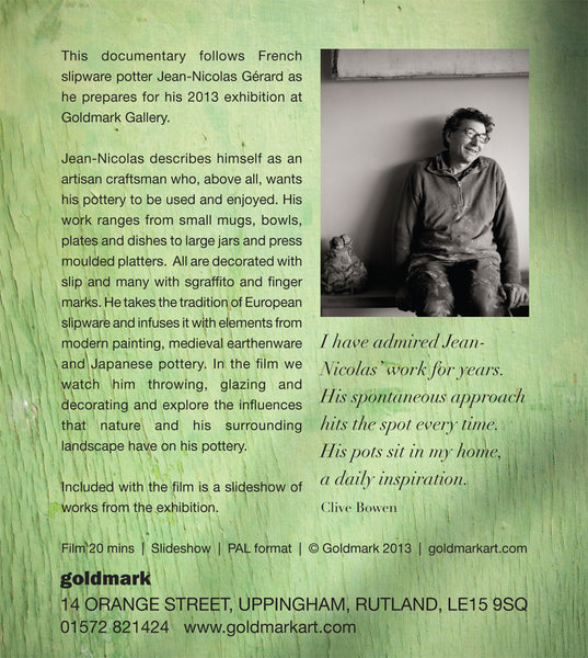 This documentary follows French slipware potter, Jean-Nicolas Gérard, as he prepares for his 2013 exhibition at Goldmark Gallery. Jean-Nicolas describes himself as an artisan craftsman who, above all, wants his pottery to be used and enjoyed. His work ranges from small mugs, bowls, plates and dishes to large jars and press moulded platters. All are decorated with slip and many with sgraffito and finger marks. He takes the tradition of European slipware and infuses it with elements from modern painting, medieval earthenware and Japanese pottery. In the film we watch him throwing, glazing and decorating and explore the influences that nature and his surrounding landscape have on his pottery. Included with the film is a slideshow of works from the exhibition and extra short films of throwing and glazing.