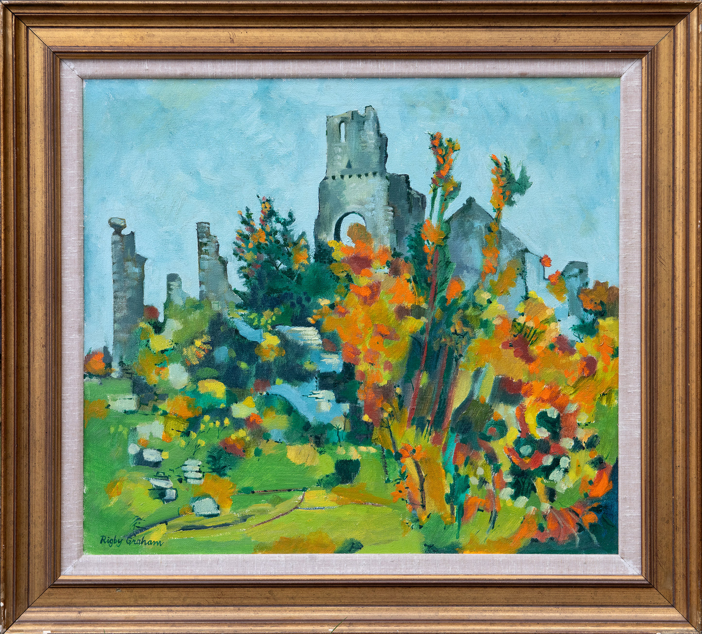 Principally a topographic artist, Rigby Graham was born in Stretford in 1931. He moved to Leicester in his early childhood where he attended Leicester College of Art, specialising in mural painting. After teaching at local schools, Graham returned to lecture at the College of Art, firstly in Graphic Design and Printing, then in Education and latterly in Bookbinding. He retired from teaching in 1983.