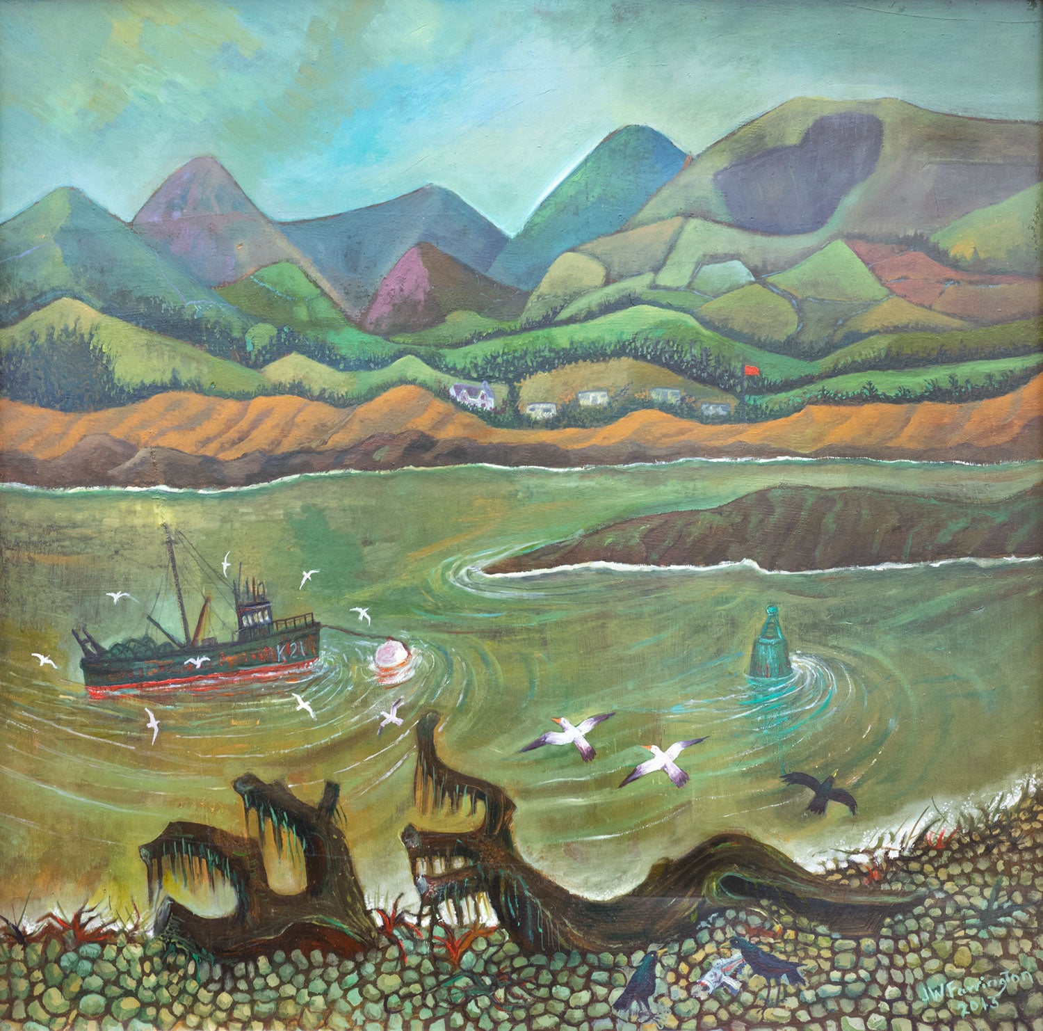 Farrington paints bird men, fairgrounds and circuses and has depicted the grimmer aspects of farming, having worked as a cowman. In 1984, he produced paintings for Granada Television’s The Ebony Tower, based on John Fowles’ novel. His painting process is all important, and involves the combination of form, colour and texture built up through the process of applying different glazed surfaces.