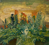 Farrington paints bird men, fairgrounds and circuses and has depicted the grimmer aspects of farming, having worked as a cowman. In 1984, he produced paintings for Granada Television’s The Ebony Tower, based on John Fowles’ novel. His painting process is all important, and involves the combination of form, colour and texture built up through the process of applying different glazed surfaces.