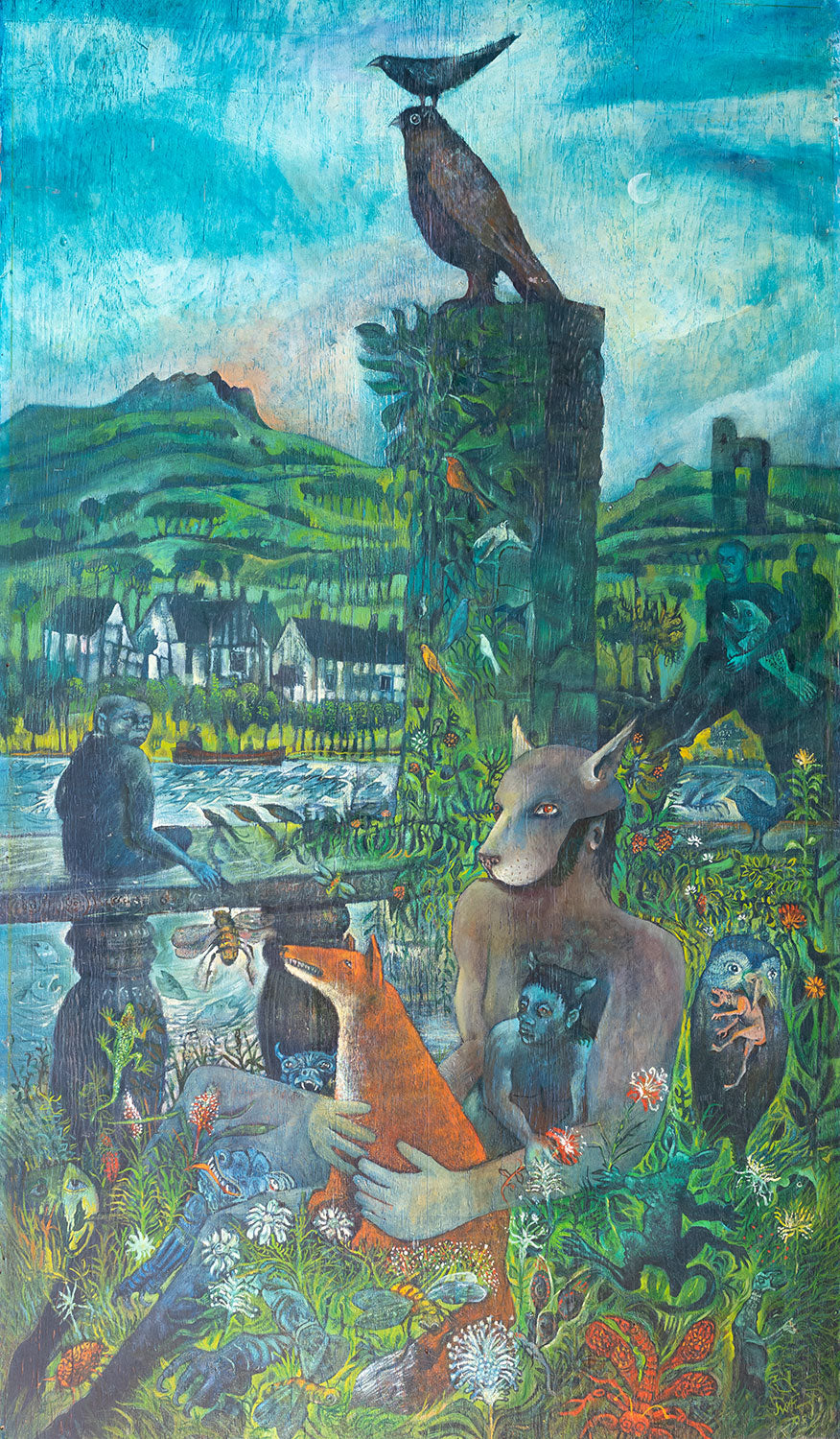 Farrington paints bird men, fairgrounds and circuses and has depicted the grimmer aspects of farming, having worked as a cowman. In 1984, he produced paintings for Granada Television’s The Ebony Tower, based on John Fowles’ novel. His painting process is all important, and involves the combination of form, colour and texture built up through the process of applying different glazed surfaces.