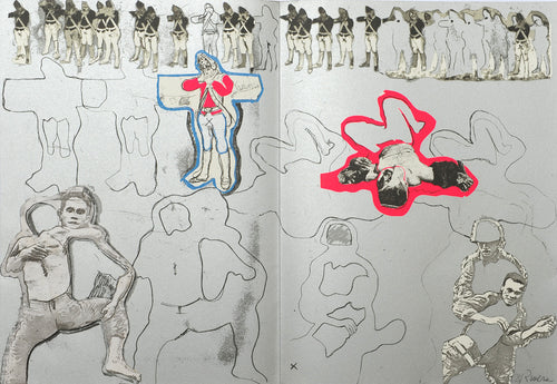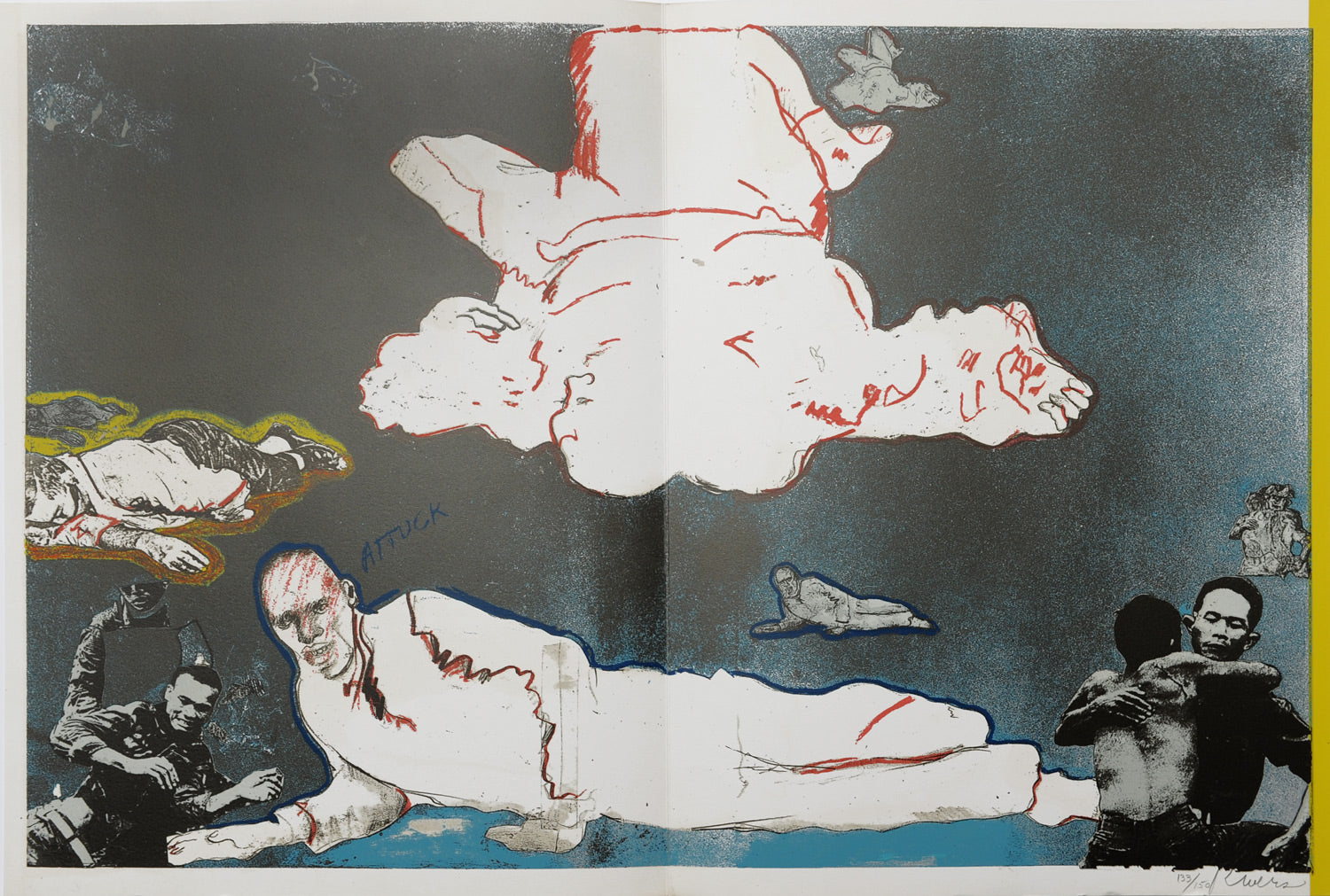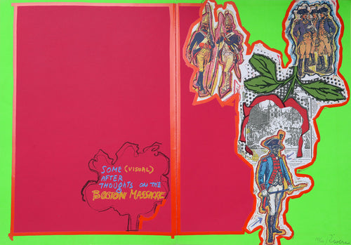 From the series of twelve serigraph prints by Post-Abstract Expressionist, Larry Rivers. The Boston Massacre (1970), juxtaposes historical events that occurred two hundred years apart to re-examine the pursuit of civil liberties and personal freedom.